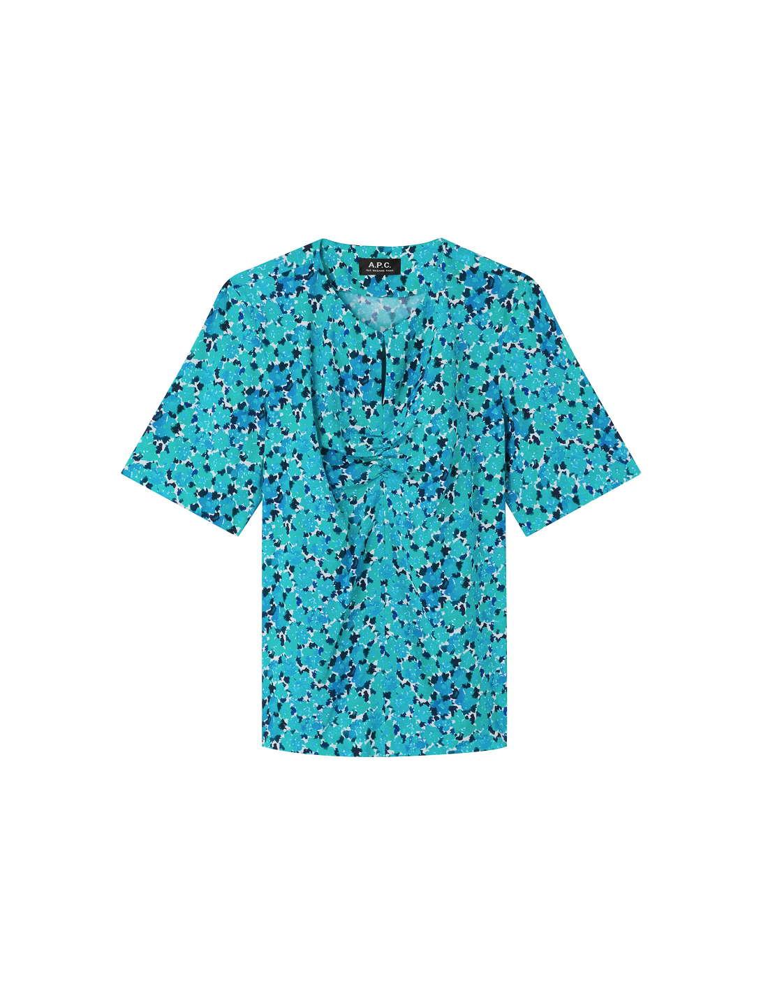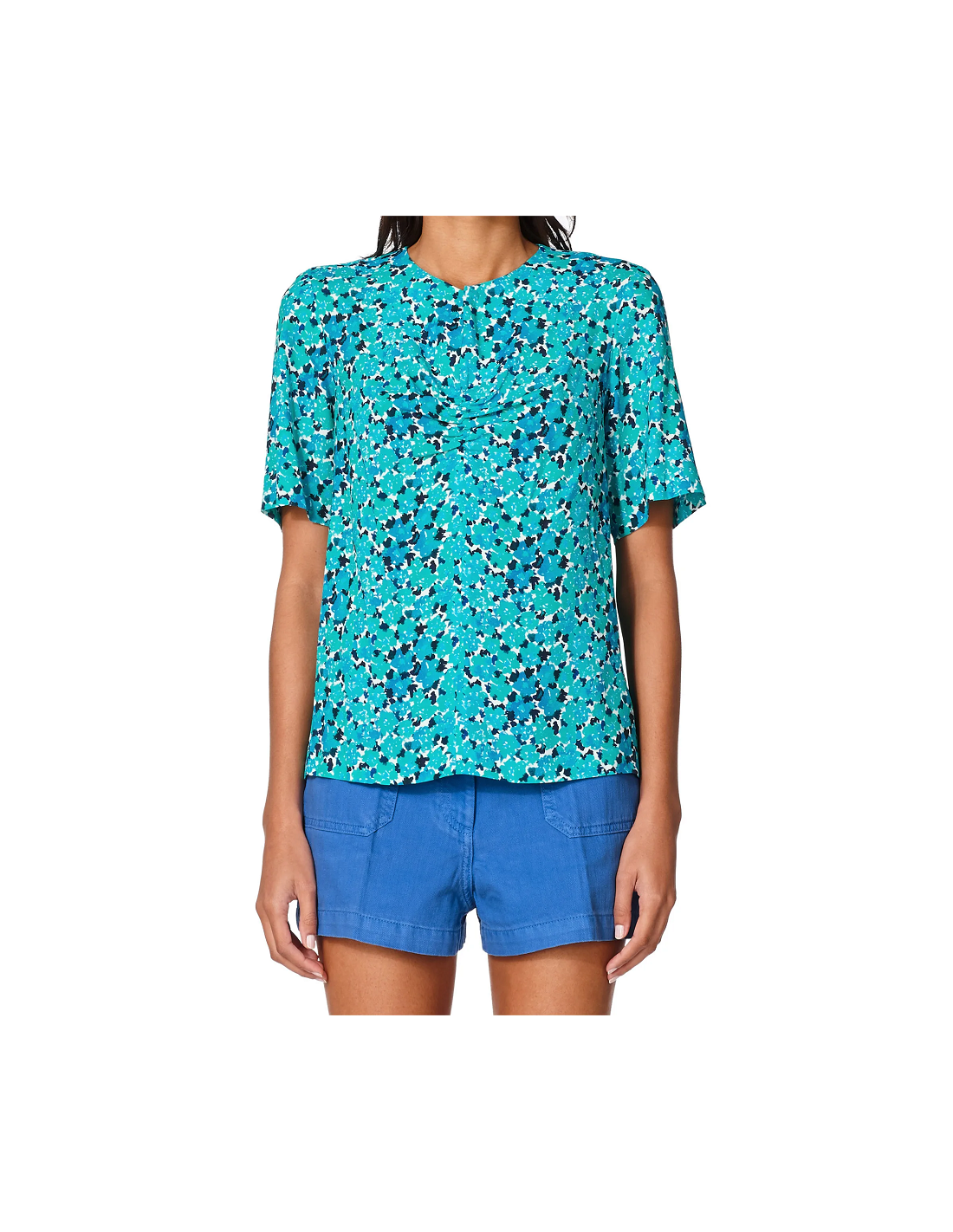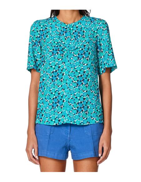 Crêpe marocain imprimé fleurs. Manches courtes. Détail de goutte à l'encolure avec des fronces en bas et un bouton en nacre.