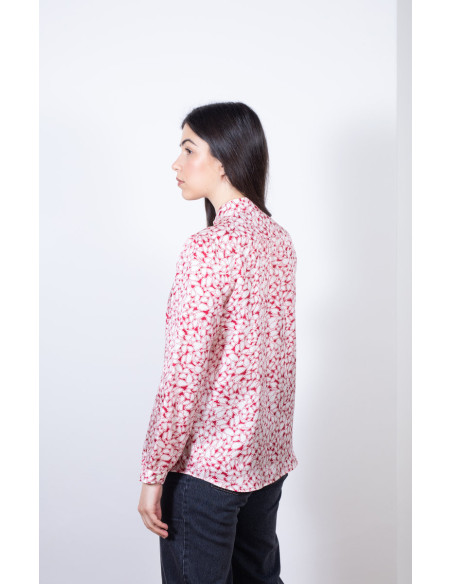 Le chemisier Aline d'A.P.C est confectionné en soie fluide avec un imprimé all over écru et framboise. Coupe droite avec base arrondie et légèrement froncée aux épaules et aux poignets. Avec un col étroit de style grand-père, une patte de boutonnage et des boutons ton sur ton. Se marie parfaitement avec un jean pour un look chic et sans effort.