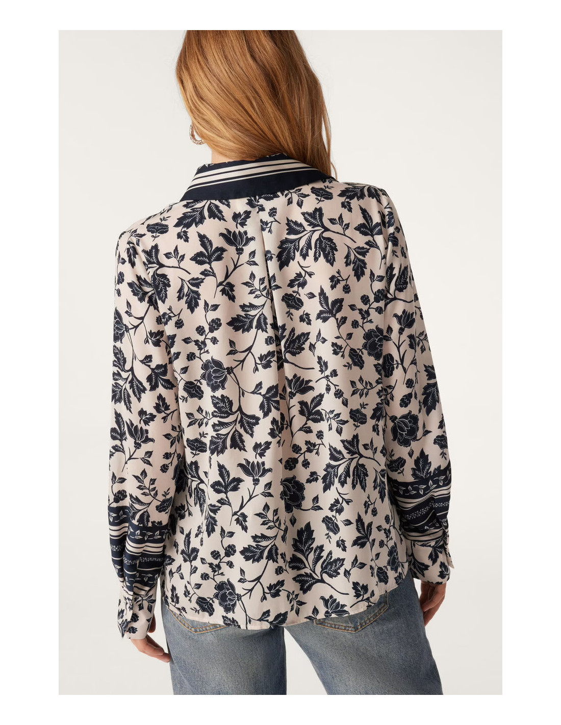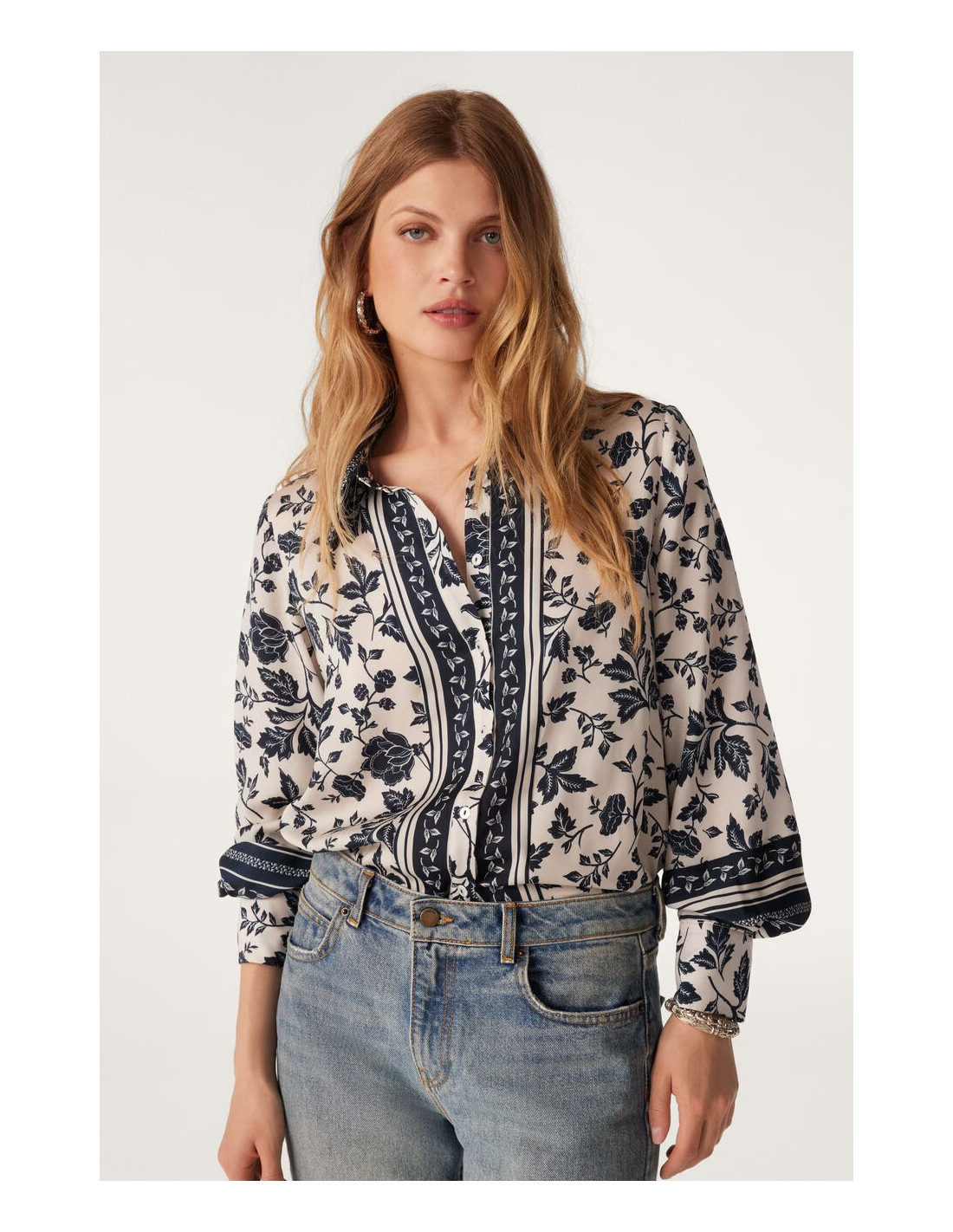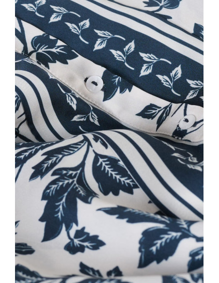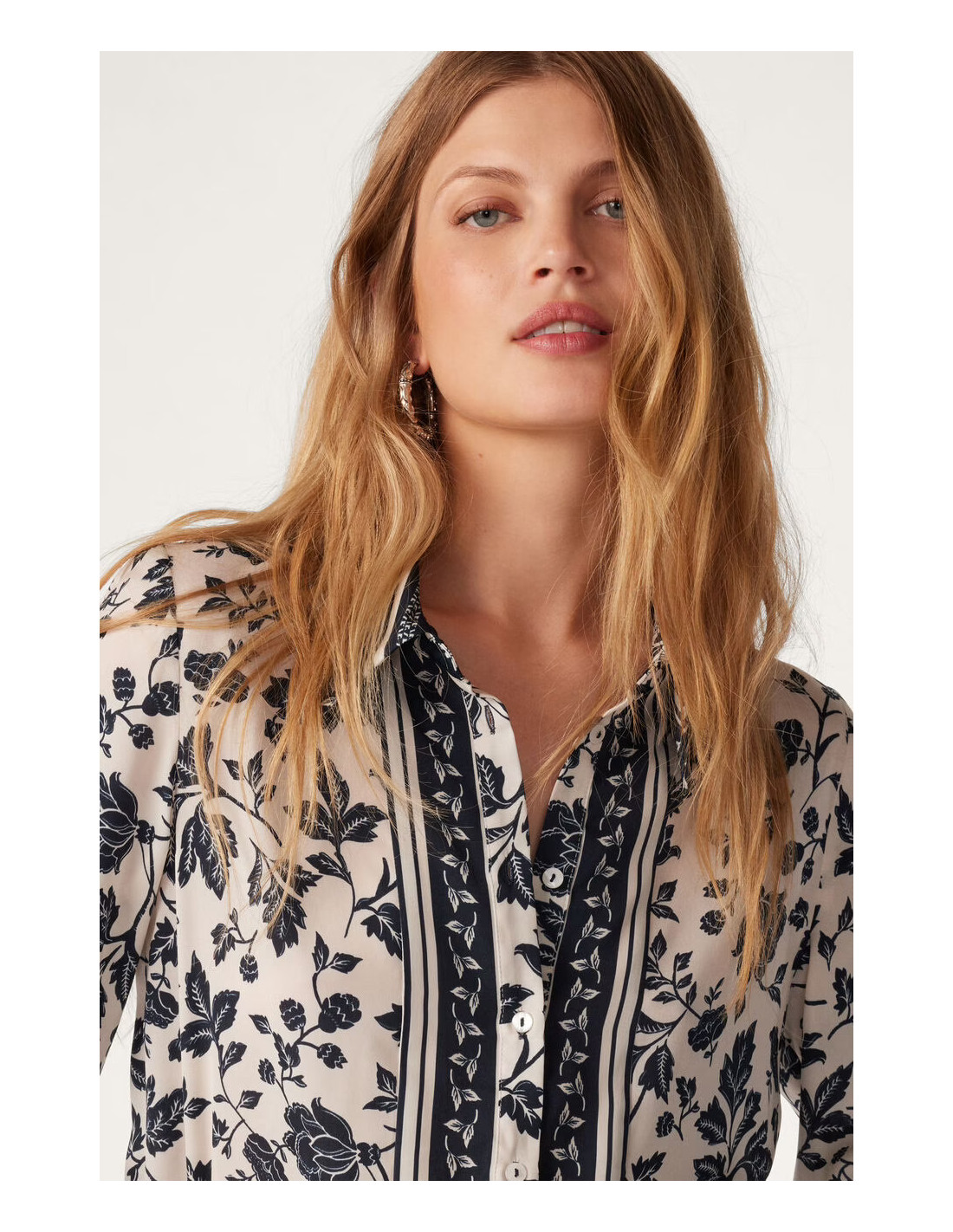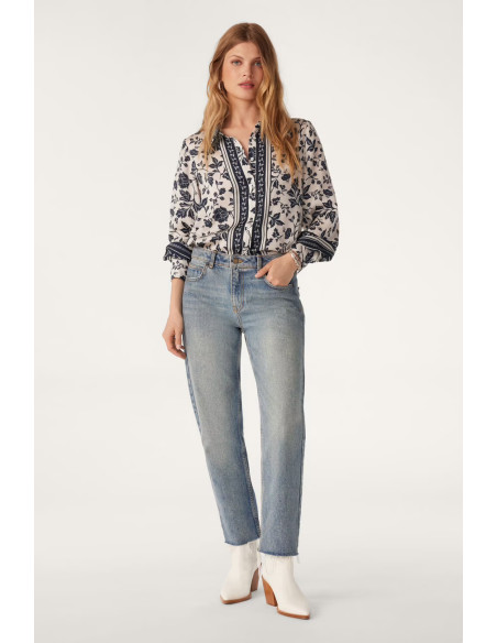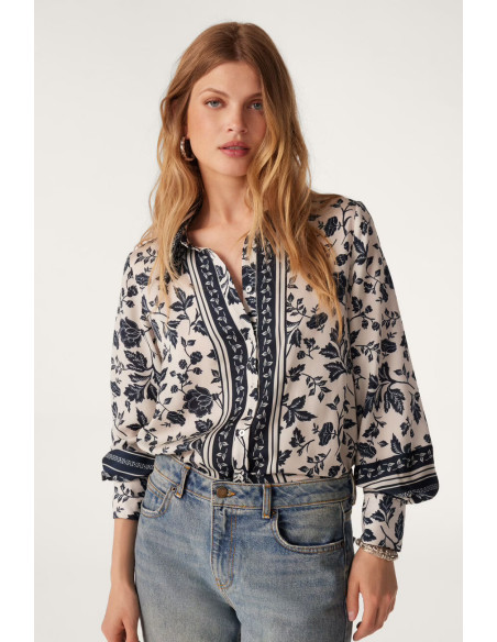 La chemise à coupe droite très agréable, manches longues, fluide, comme une caresse sur la peau. stylée, un mélange d'imprimés floraux et de frises, met immédiatement de bonne humeur. possède des découpes aux épaules et un jeu de contrastes au niveau de la patte de boutonnage avec les frises disposées le long de cette dernière.