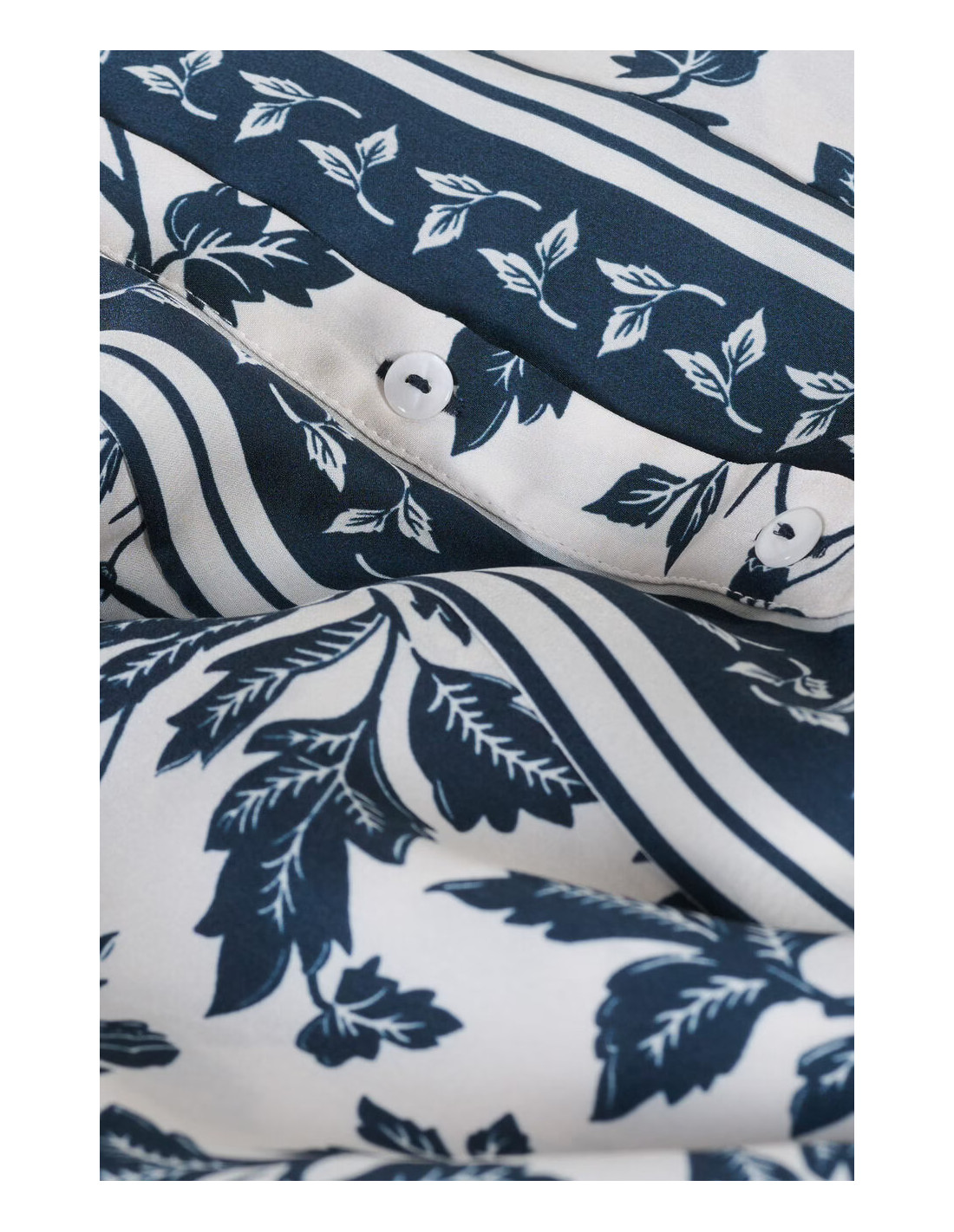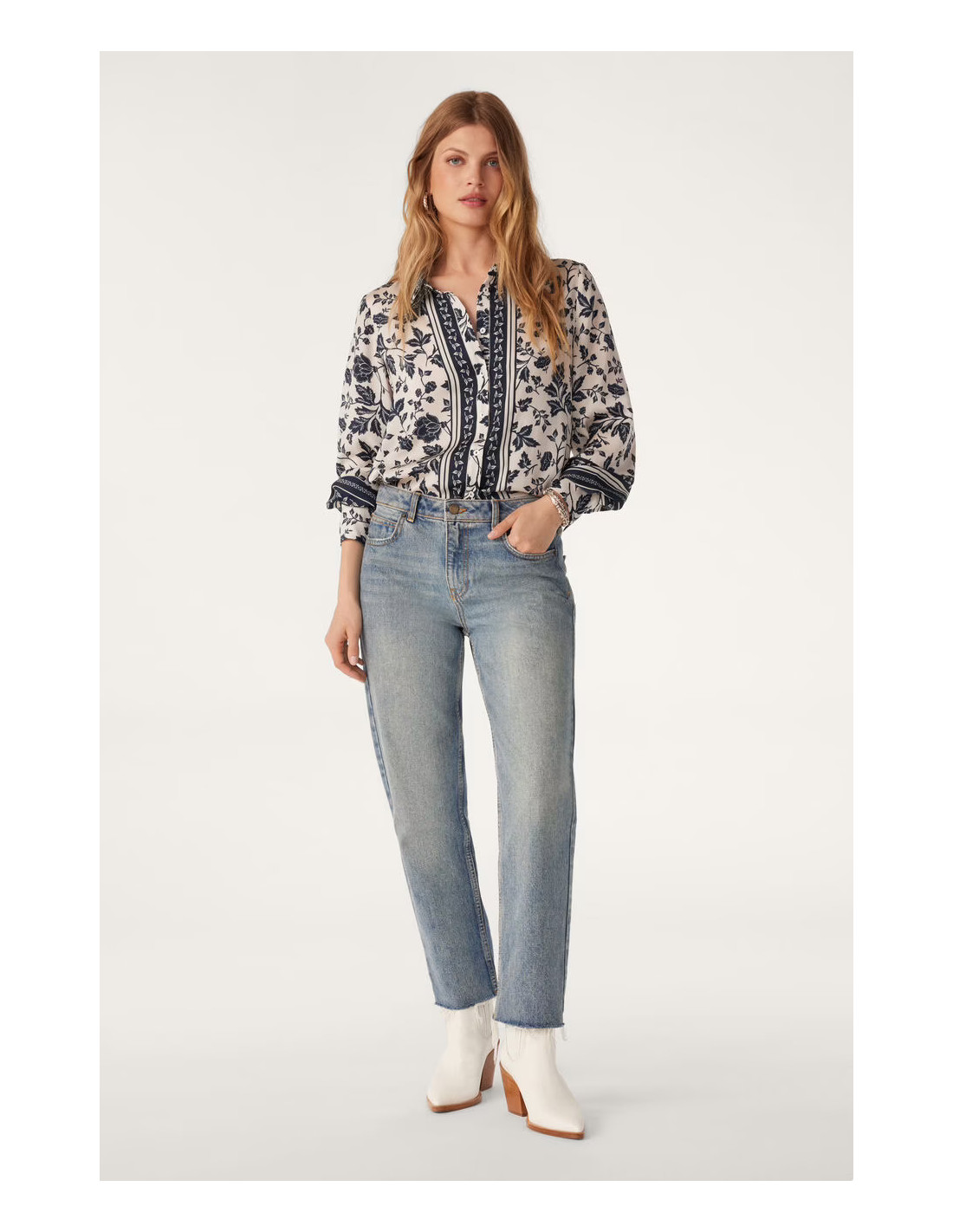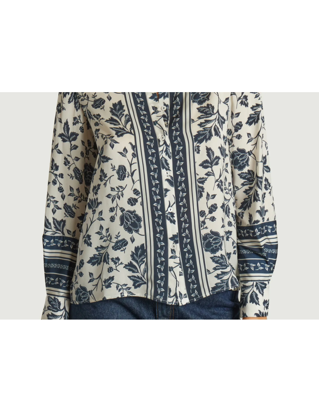 La chemise à coupe droite très agréable, manches longues, fluide, comme une caresse sur la peau. stylée, un mélange d'imprimés floraux et de frises, met immédiatement de bonne humeur. possède des découpes aux épaules et un jeu de contrastes au niveau de la patte de boutonnage avec les frises disposées le long de cette dernière.