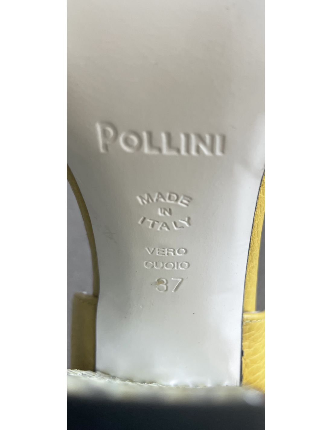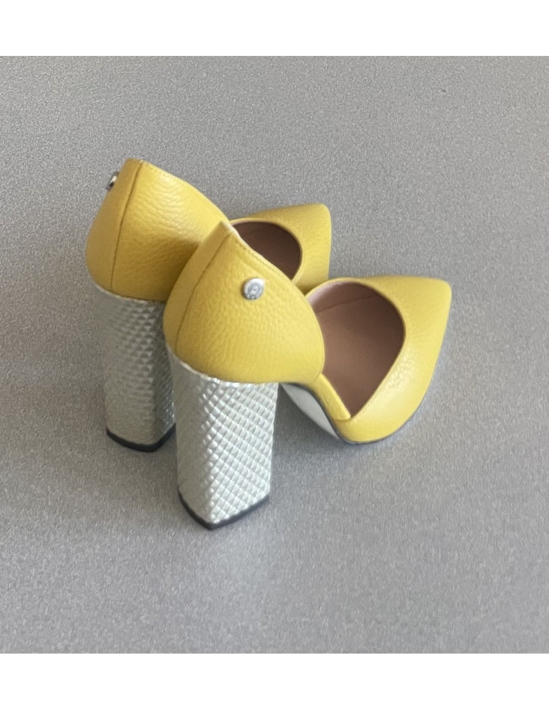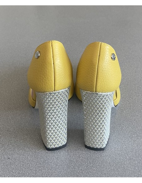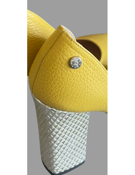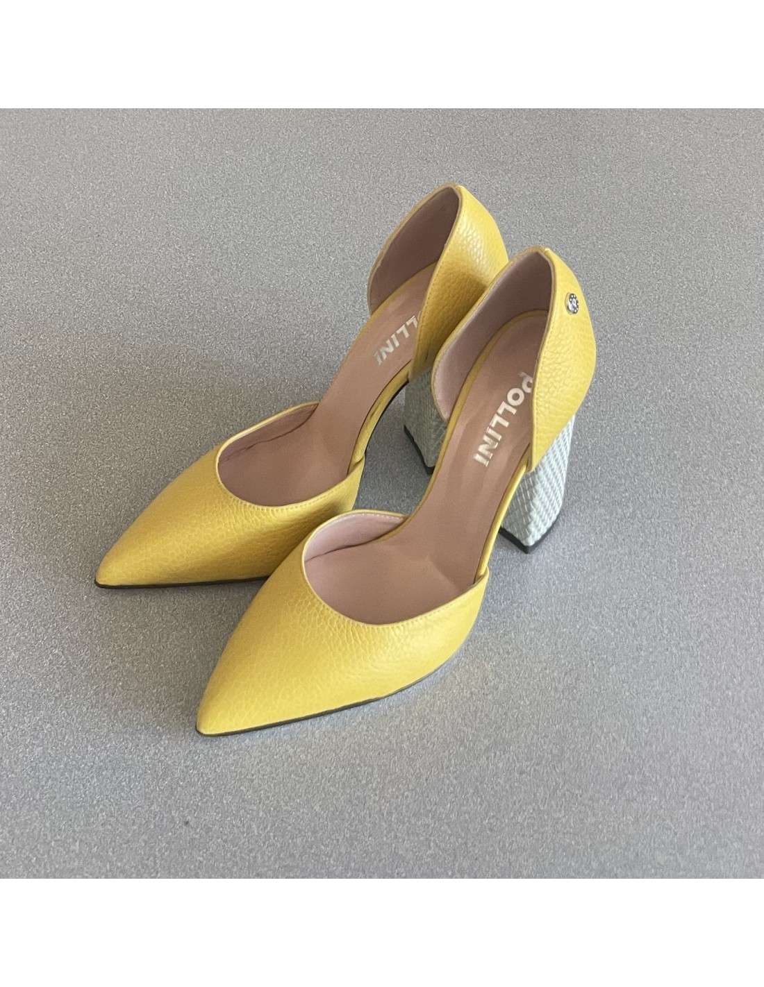Chaussures Pollini en cuir jaunes, hauteur des talons 11 cm, bout pointu.