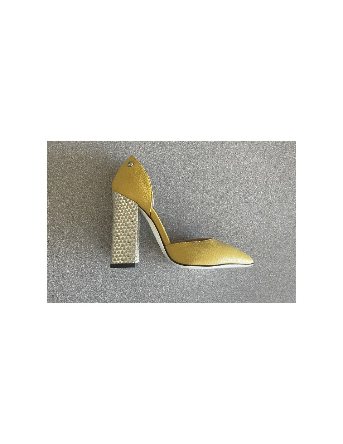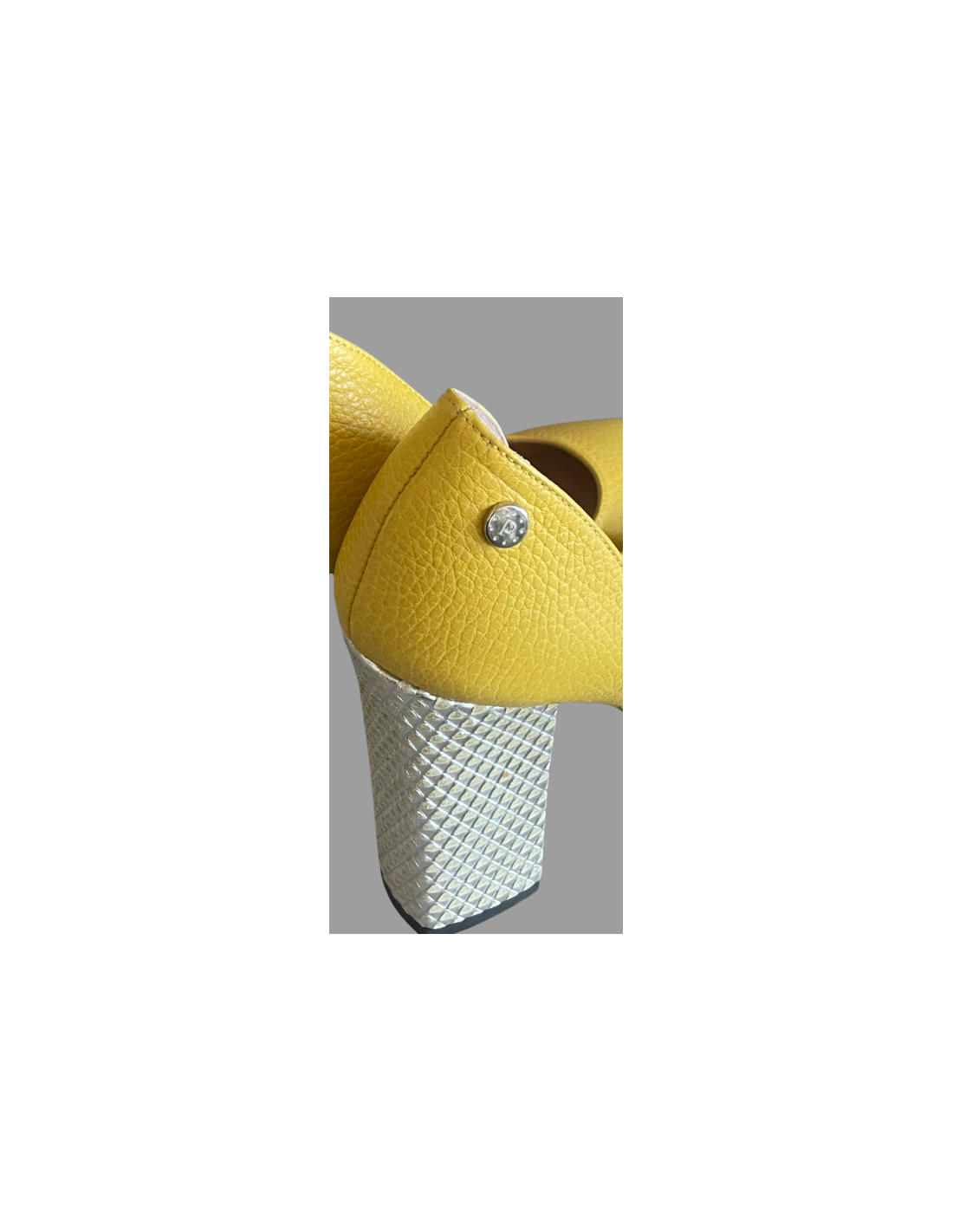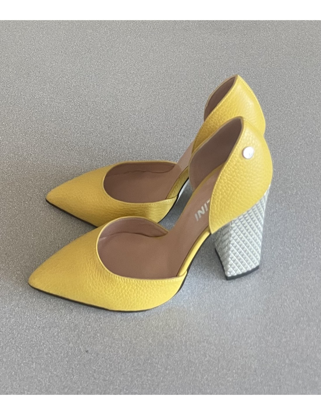 Chaussures Pollini en cuir jaunes, hauteur des talons 11 cm, bout pointu.
