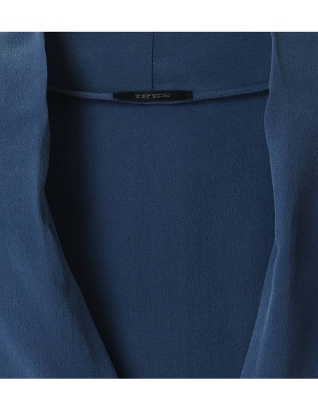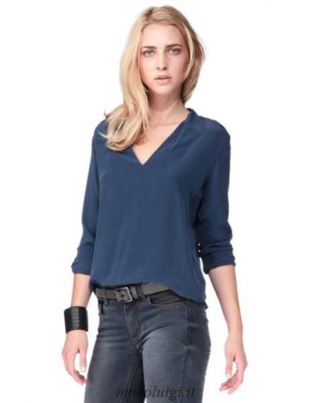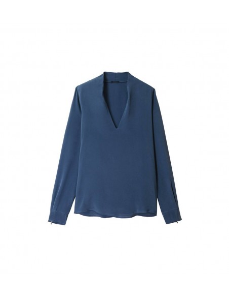 Blouse en soie, unie, à la coupe droite, aux manches longues, au col V et à la base asymétrique. Elle est munie de poignets zippés et d'un petit empiècement en métal siglé en haut du dos.