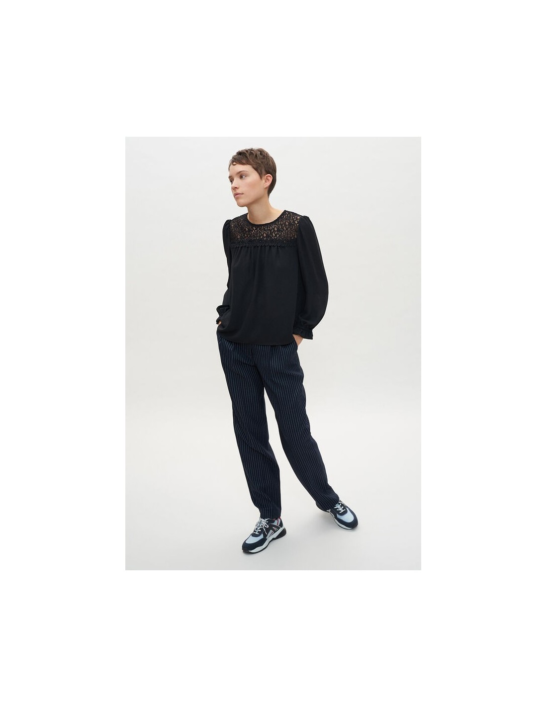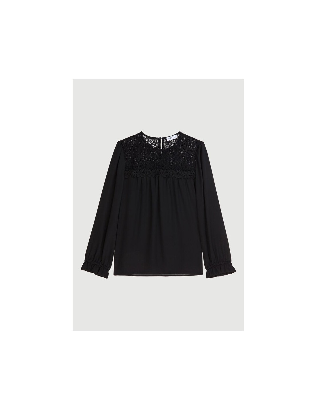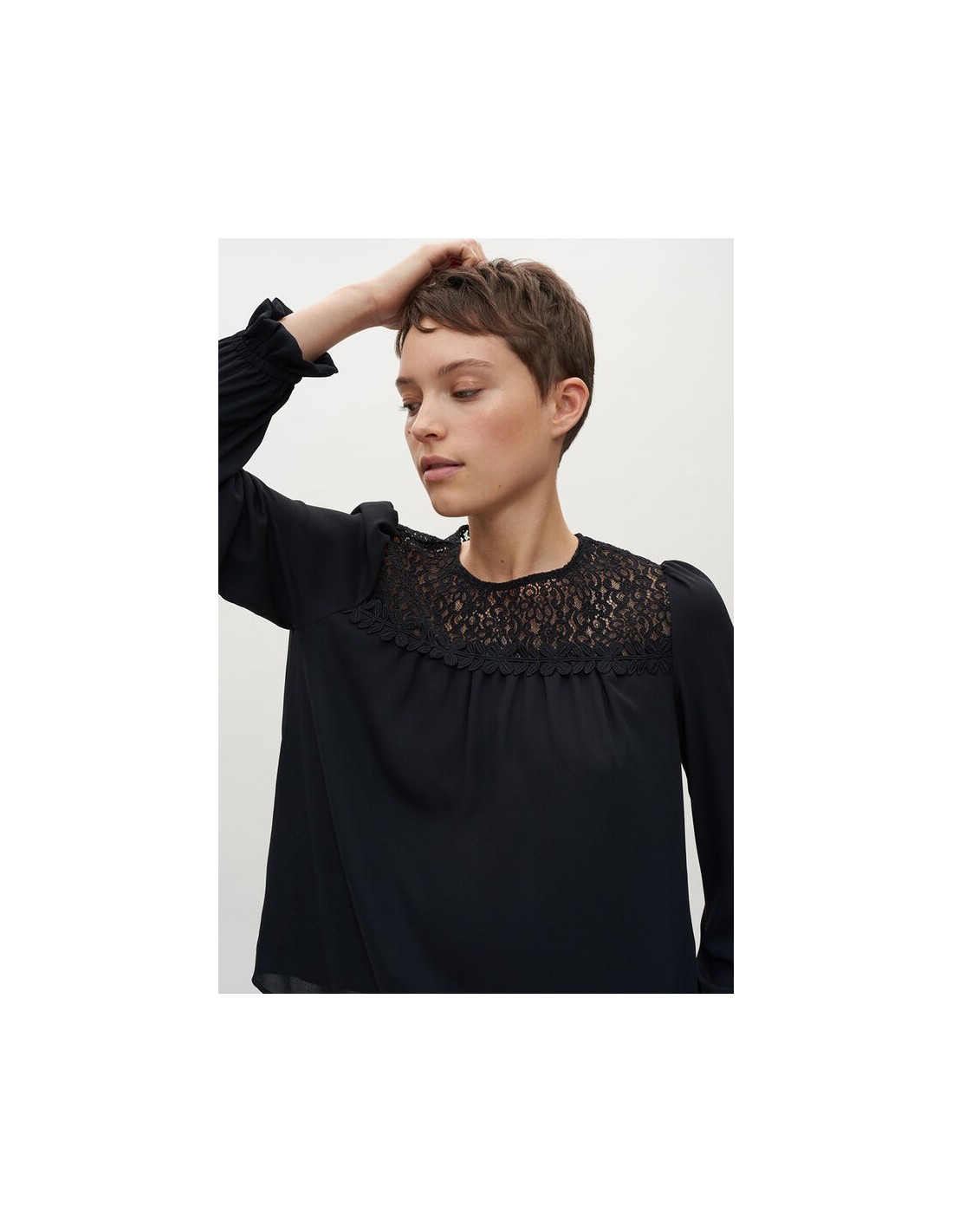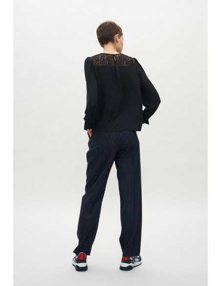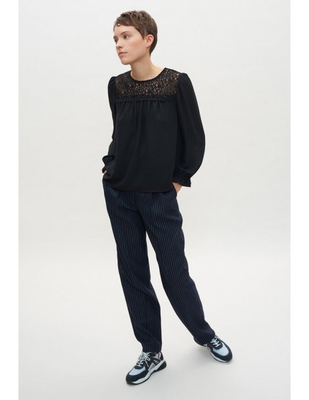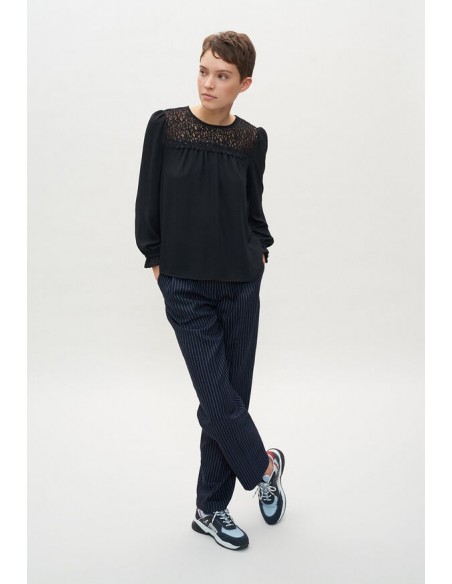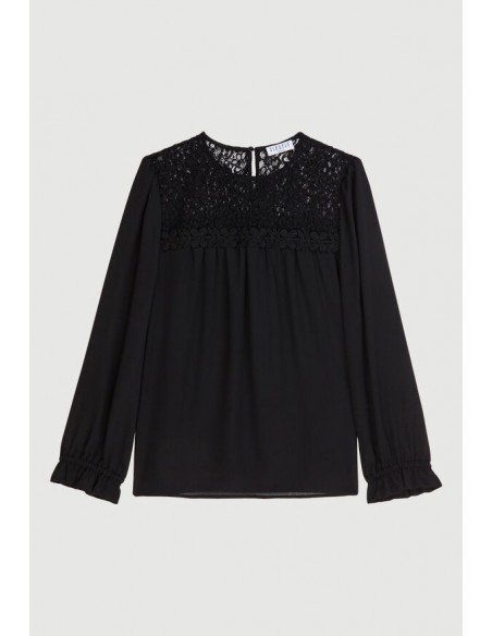 Le top au chic ténébreux. Blouse noire à dentelle. Coupe droite légèrement oversize et manches trois quarts ballon.
