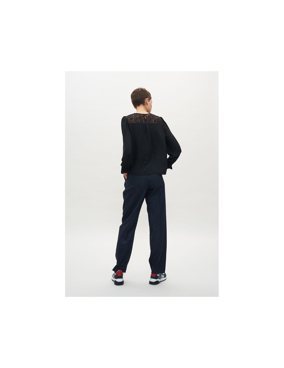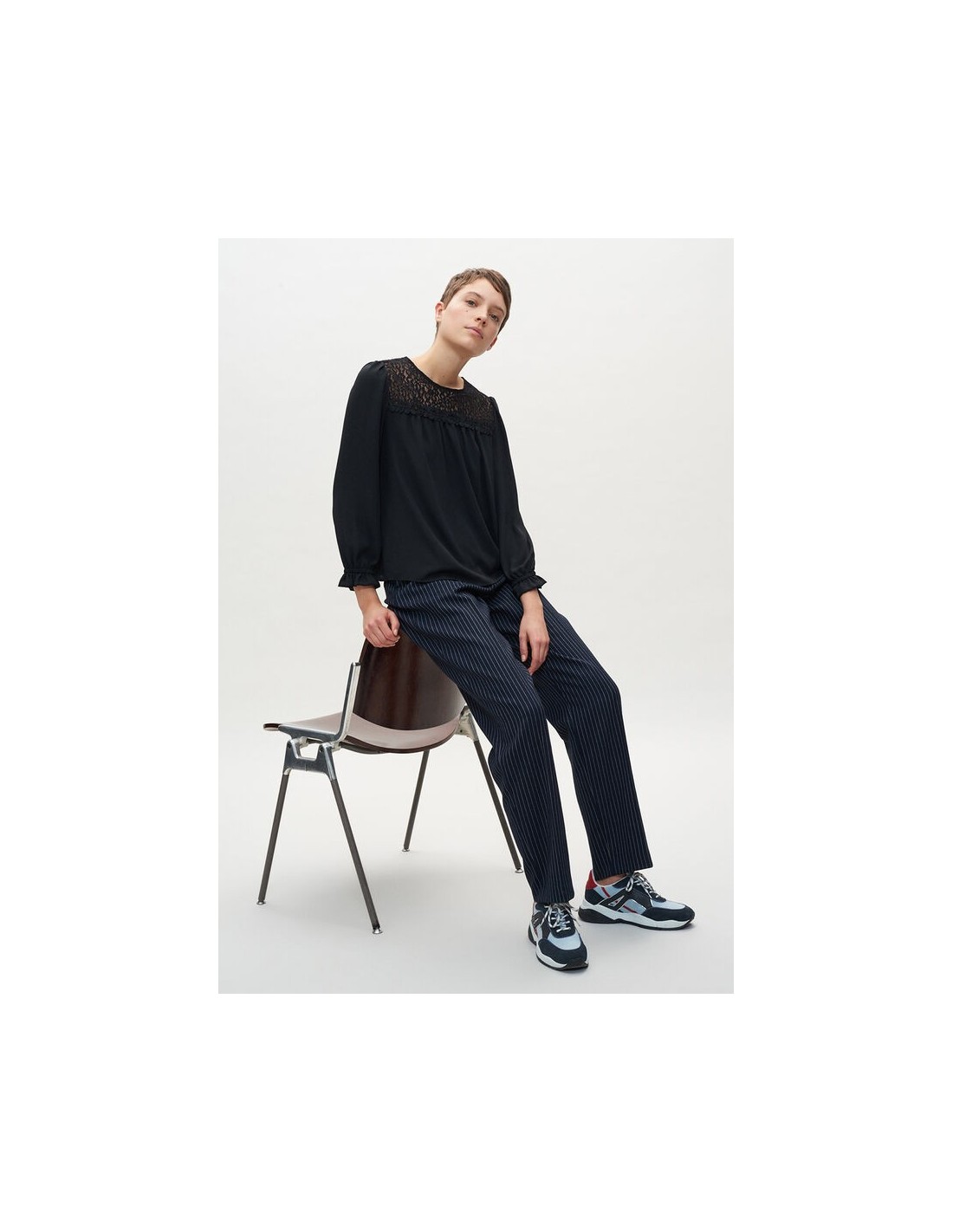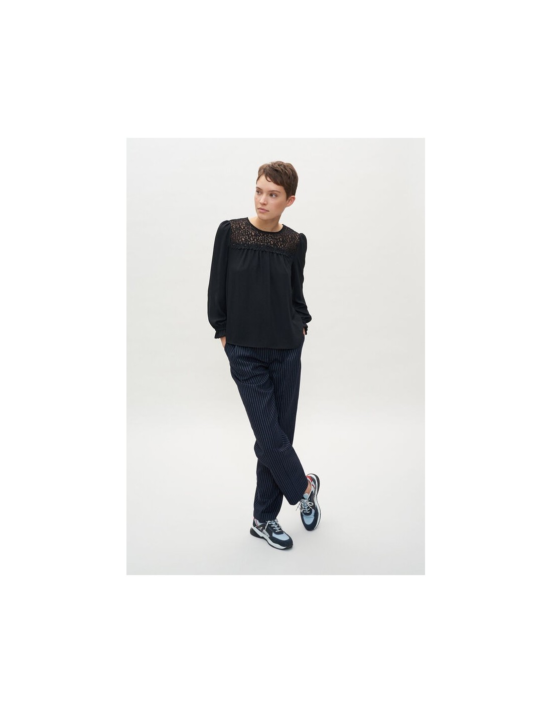 Le top au chic ténébreux. Blouse noire à dentelle. Coupe droite légèrement oversize et manches trois quarts ballon.