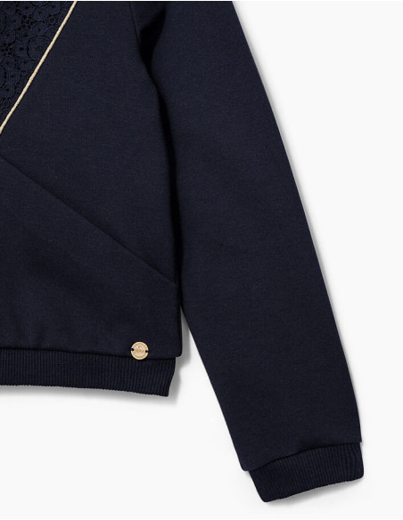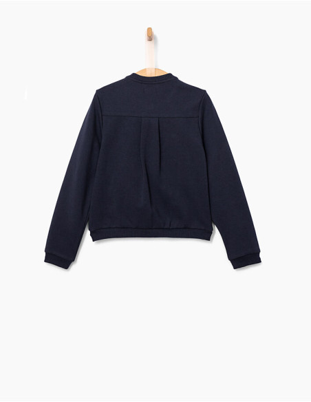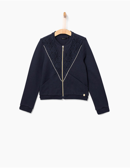 Le cardigan marine zippé esprit bomber change de style. Avec son jeu d'empiècements, sa dentelle sur le devant et ses passepoils dorés, il impose son allure à la silhouette College des petites filles.