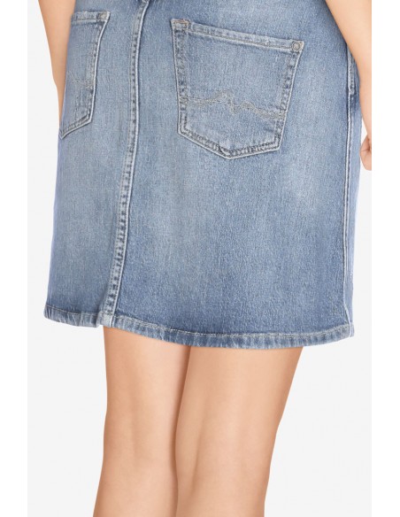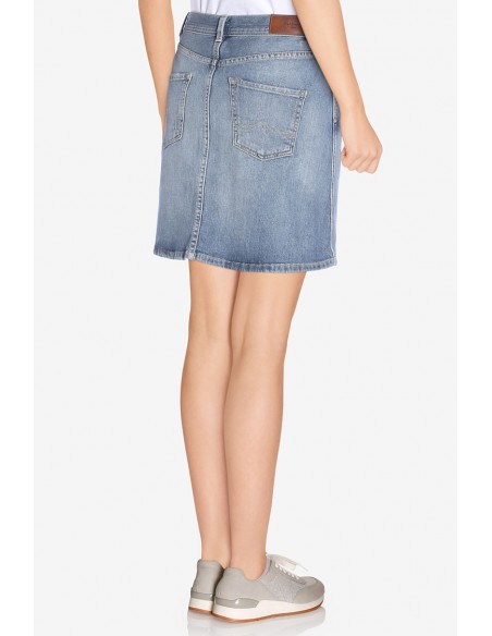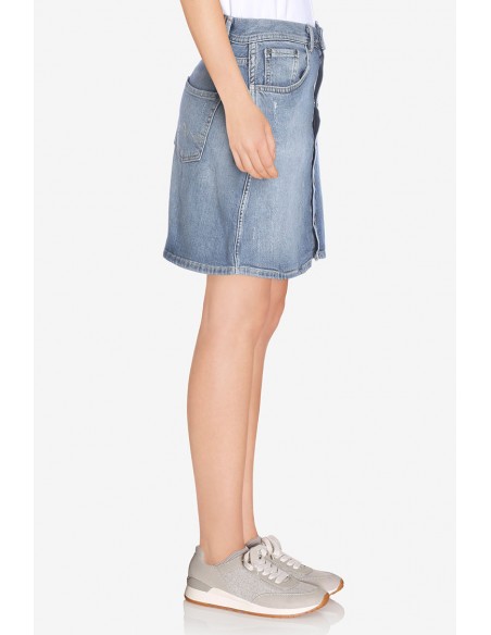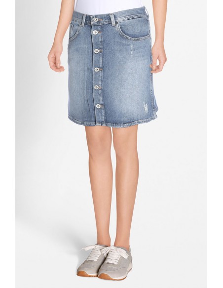 Jupe en denim usé et délavé, présente des accrocs déco. Elle propose une coupe évasée féminine, avec 5 poches rivetées et un boutonnage devant avec des boutons métal siglés. Sa ceinture est montée sur passant et les poches arrière sont ornées de discrètes surpiqûres. Jacron cuir au dos.