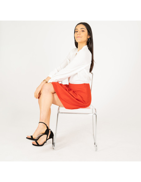 Longueur mi-cuisse, légère mais décente. Fermeture par un zip invisible sur le côté.