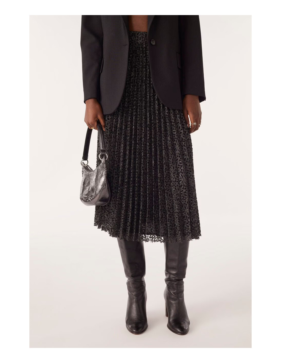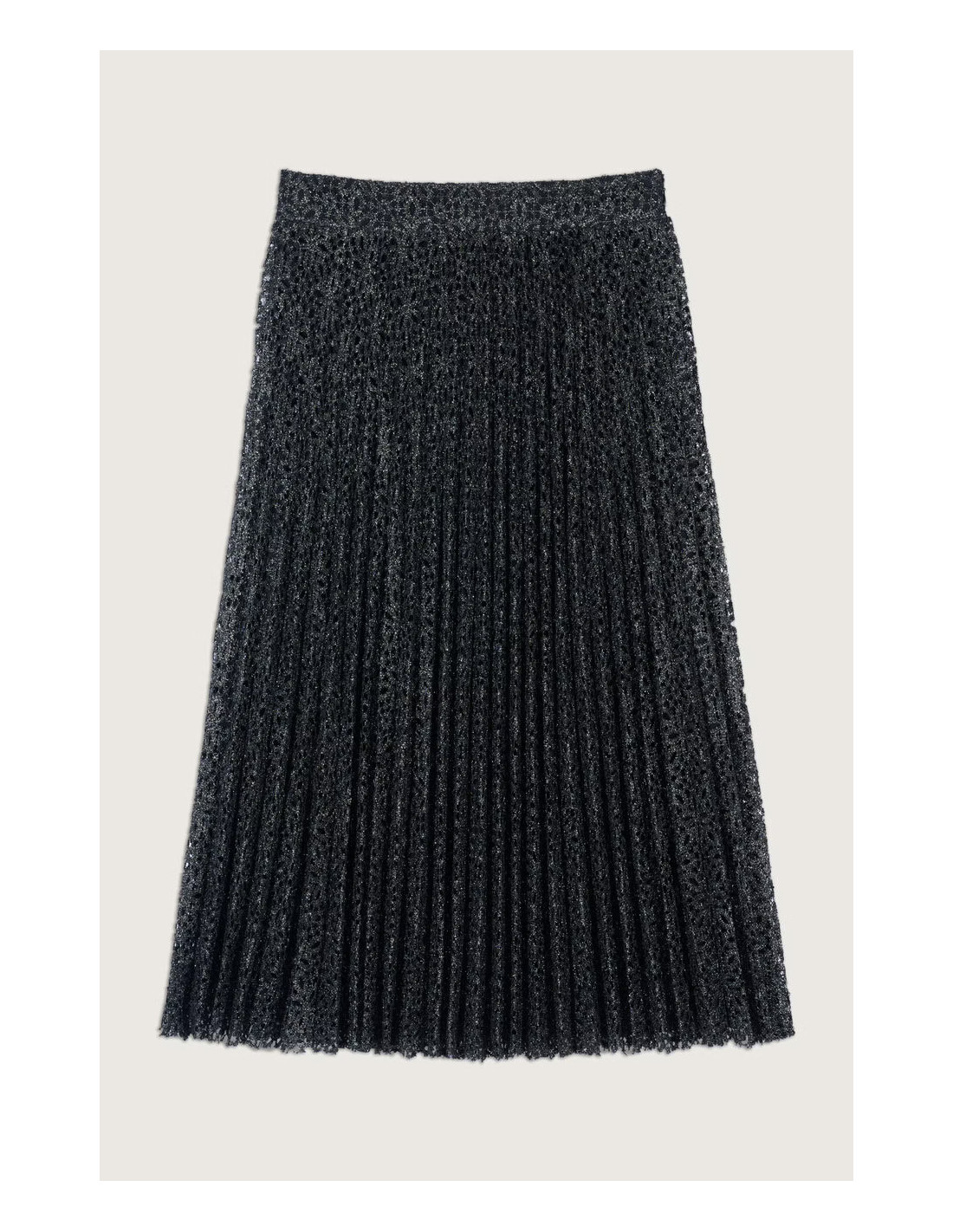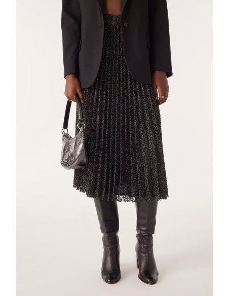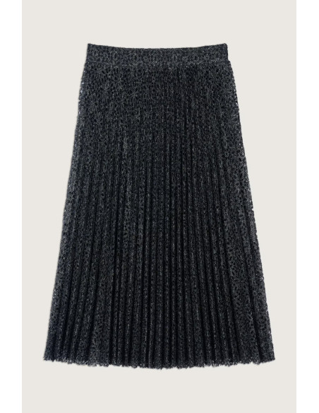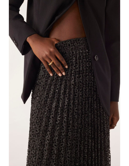 Irrésistible avec son tombé fluide qui sublime notre silhouette, la jupe CAMILLE séduit par ses nombreux atouts. On adore ce modèle plissé qui se distingue par une maille fantaisie ajourée qui vient surmonter une doublure ton sur ton. Les fils métalliques inclus dans sa composition apportent un côté glamour et contemporain pour illuminer notre look ! Une jupe à porter avec des bottes à talon pour affirmer sa féminité ou avec des sneakers pour un style décalé.