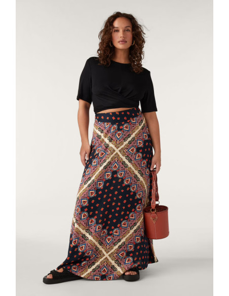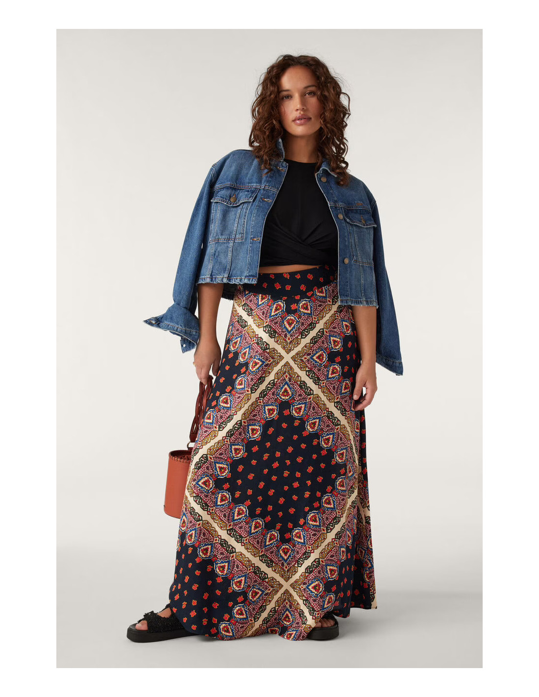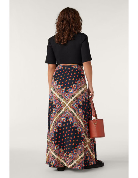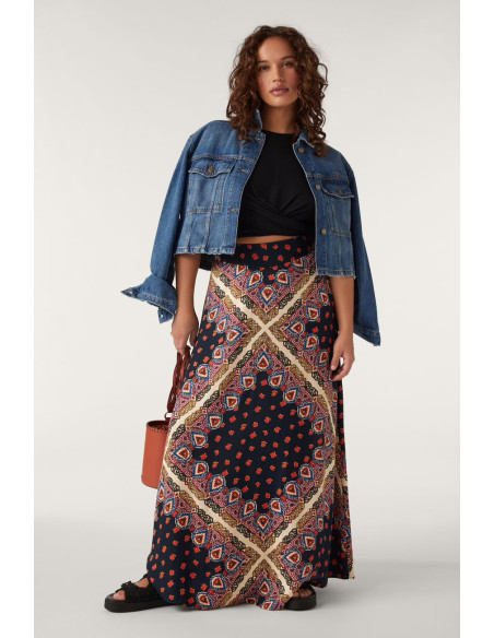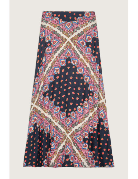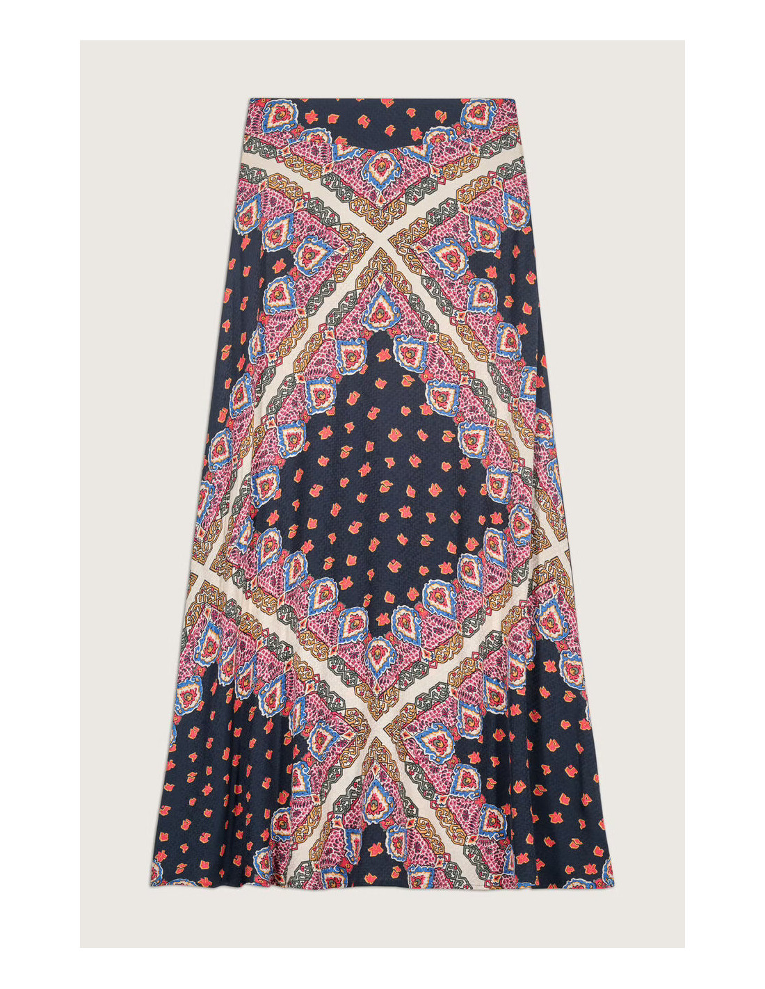La jupe JULIA a un look bohème. Le modèle tire son inspiration des années Biba des 70's en adoptant une longueur maxi et une taille haute mise en valeur par une découpe ceinture. Elle est bien ajustée sur les hanches avant de s'évaser vers le bas, créant une jolie silhouette féminine. Le tissu fluide accompagne les mouvements avec légèreté. Motif façon foulards ethniques travaillés en placements losanges.