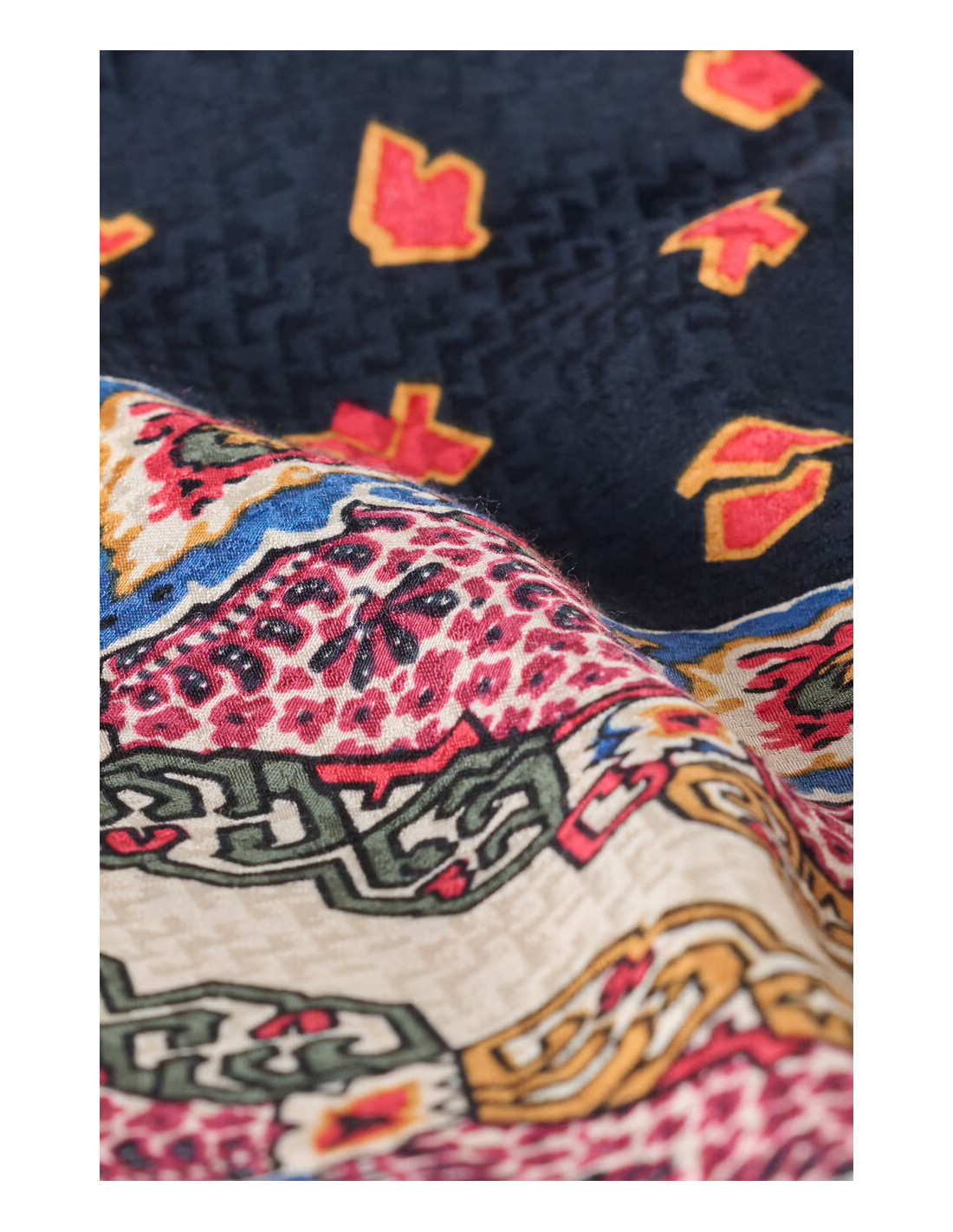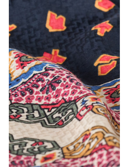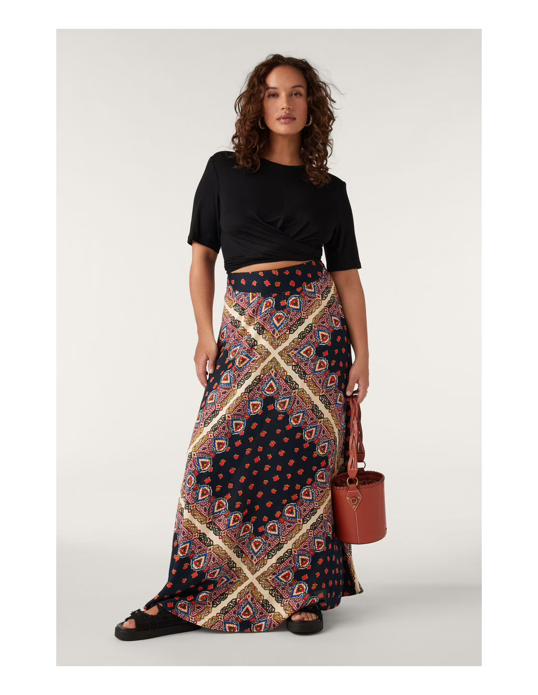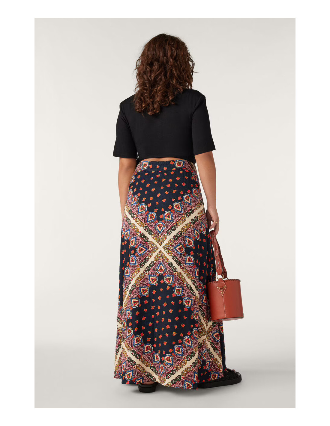 La jupe JULIA a un look bohème. Le modèle tire son inspiration des années Biba des 70's en adoptant une longueur maxi et une taille haute mise en valeur par une découpe ceinture. Elle est bien ajustée sur les hanches avant de s'évaser vers le bas, créant une jolie silhouette féminine. Le tissu fluide accompagne les mouvements avec légèreté. Motif façon foulards ethniques travaillés en placements losanges.
