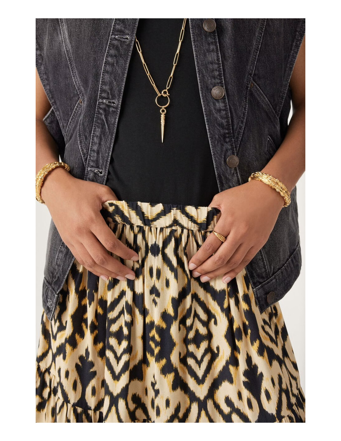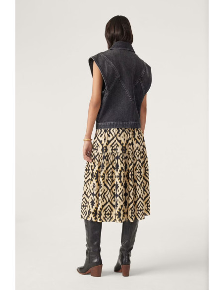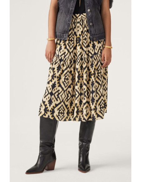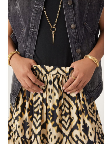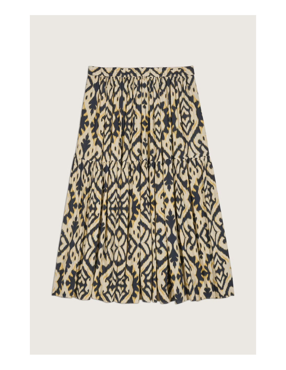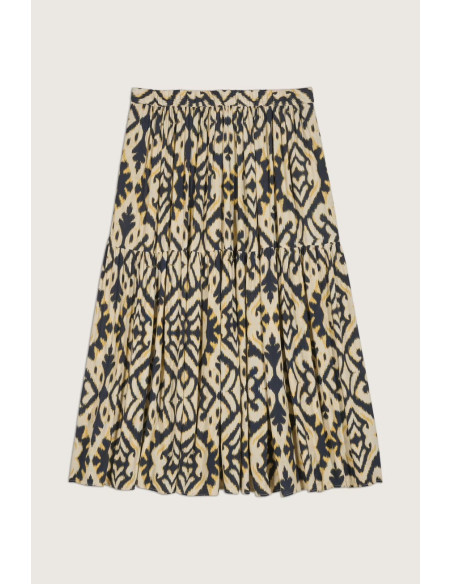 Jupe ultra confortable façon jupon, elle est fluide et très agréable sur la peau. Légèrement évasée avec ses différents panneaux froncés. Elastiquée au niveau de la taille. Imprimés inspirés IKAT, tellement bohème