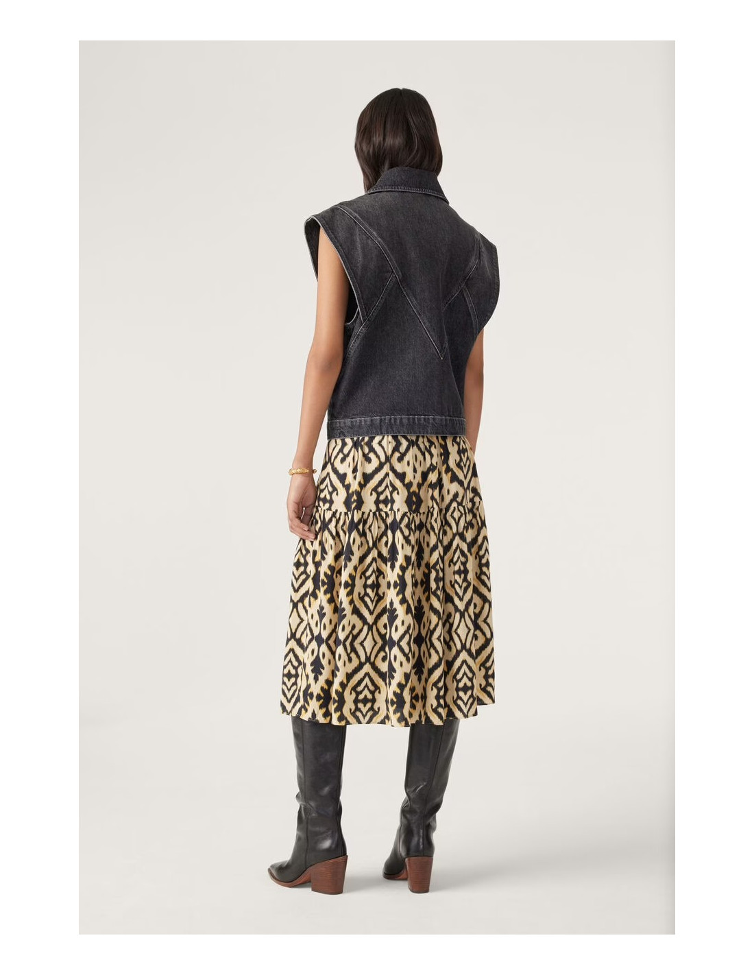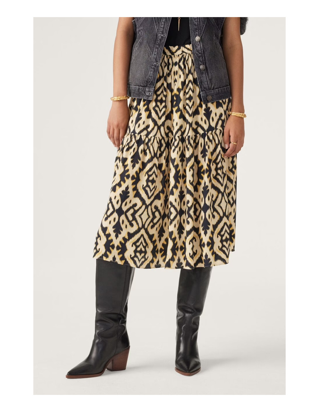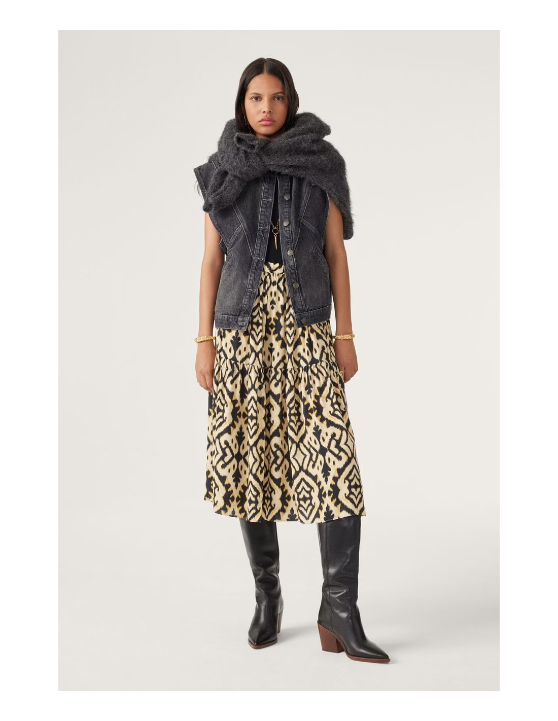 Jupe ultra confortable façon jupon, elle est fluide et très agréable sur la peau. Légèrement évasée avec ses différents panneaux froncés. Elastiquée au niveau de la taille. Imprimés inspirés IKAT, tellement bohème