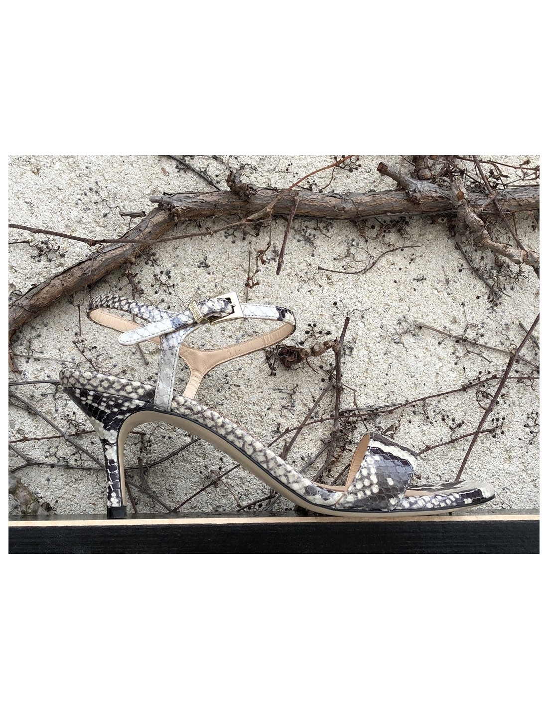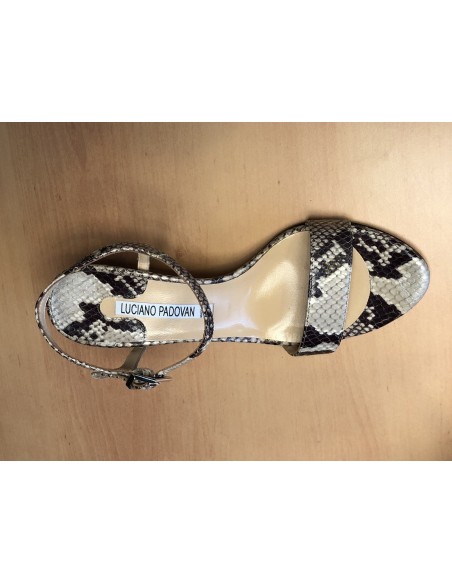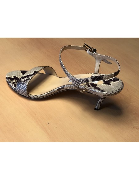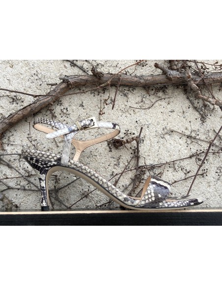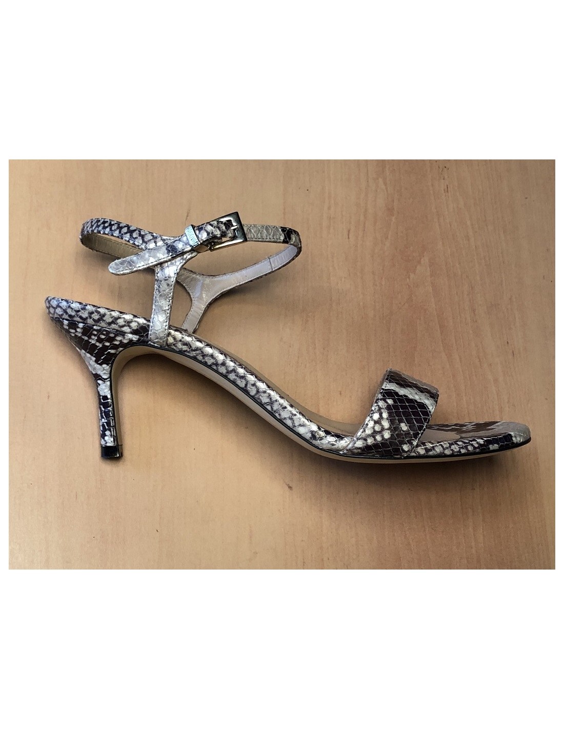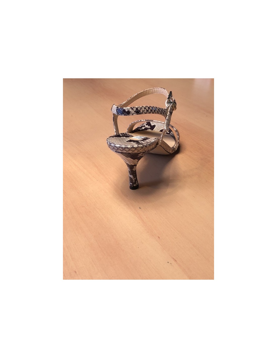 Sandales imprimé serpent, boucle gravé du logo de la marque. Pointe arrondie, talon mi-long recouvert doublure en cuir