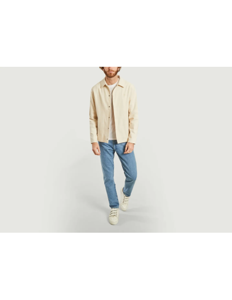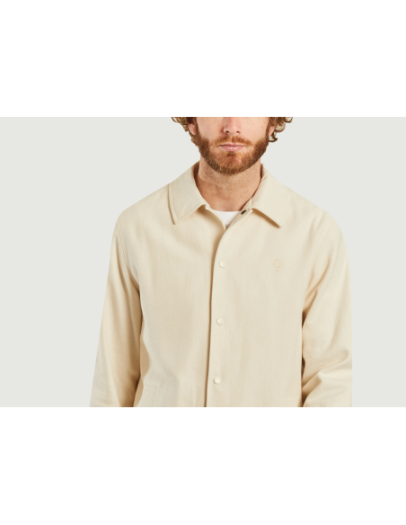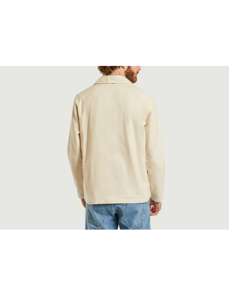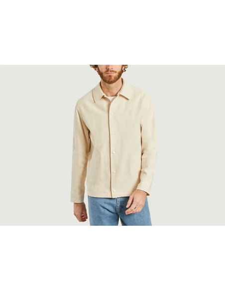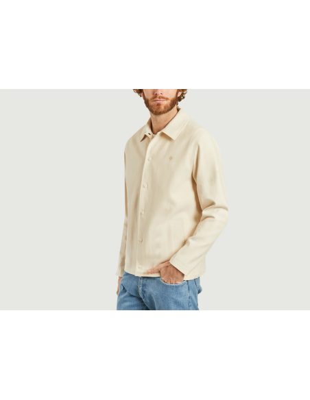 Veste/Surchemise Sologne en sergé de coton épais coloris écru, manches longues, col classique, fermeture boutonné à l'avant, surpiqûres constrastées, coupe droite.