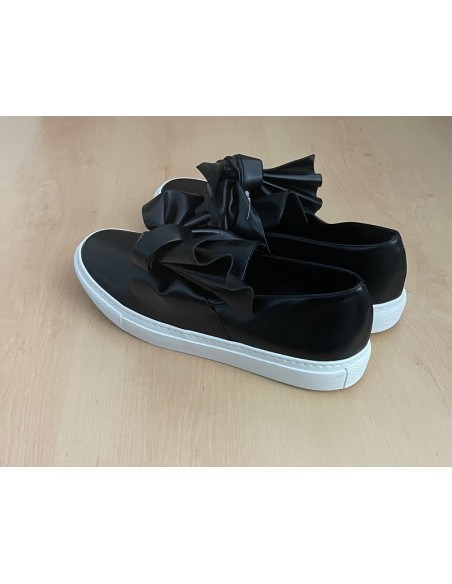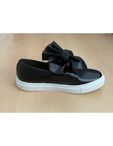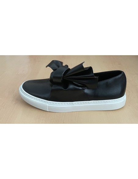 Baskets en cuir poli métallisé noires. Bout rond, boucle décorative à l'empeigne. Semelle en caoutchouc. Coutures ton sur ton. Fabriquées au Portugal.