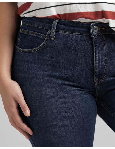 Le fini bleu moyen très facile à porter est gai et épuré ; il est rehaussé de détails liés à son traitement qui apportent une petite touche vintage en toute subtilité, notamment des plis et des effets marbrés à la taille.