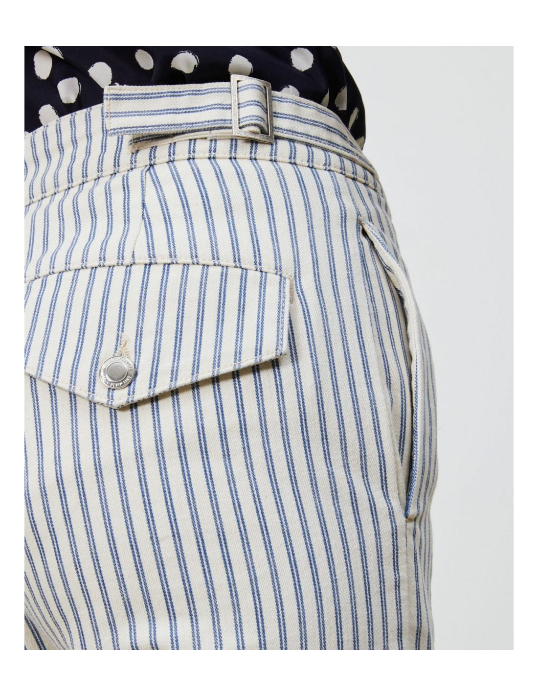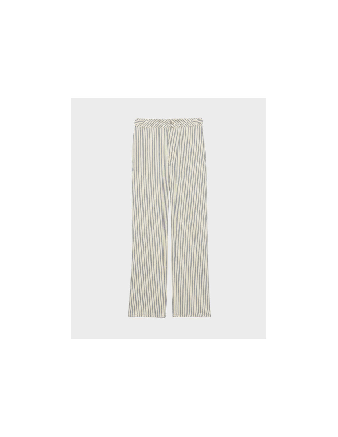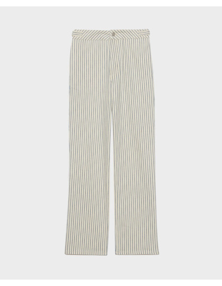 Pantalon en toile denim écrue à rayures bleues.