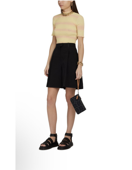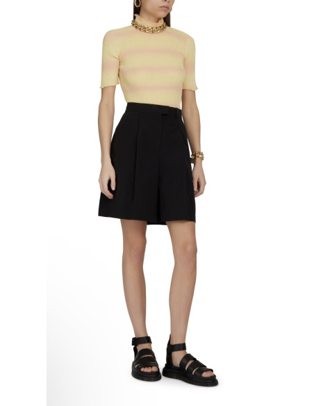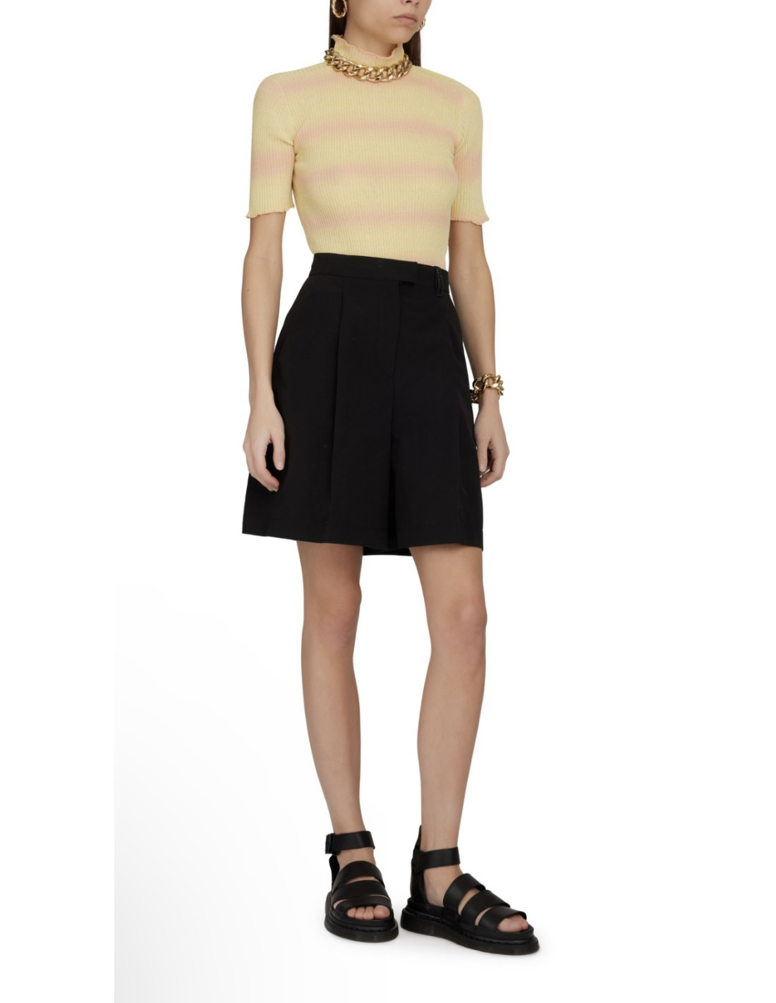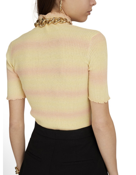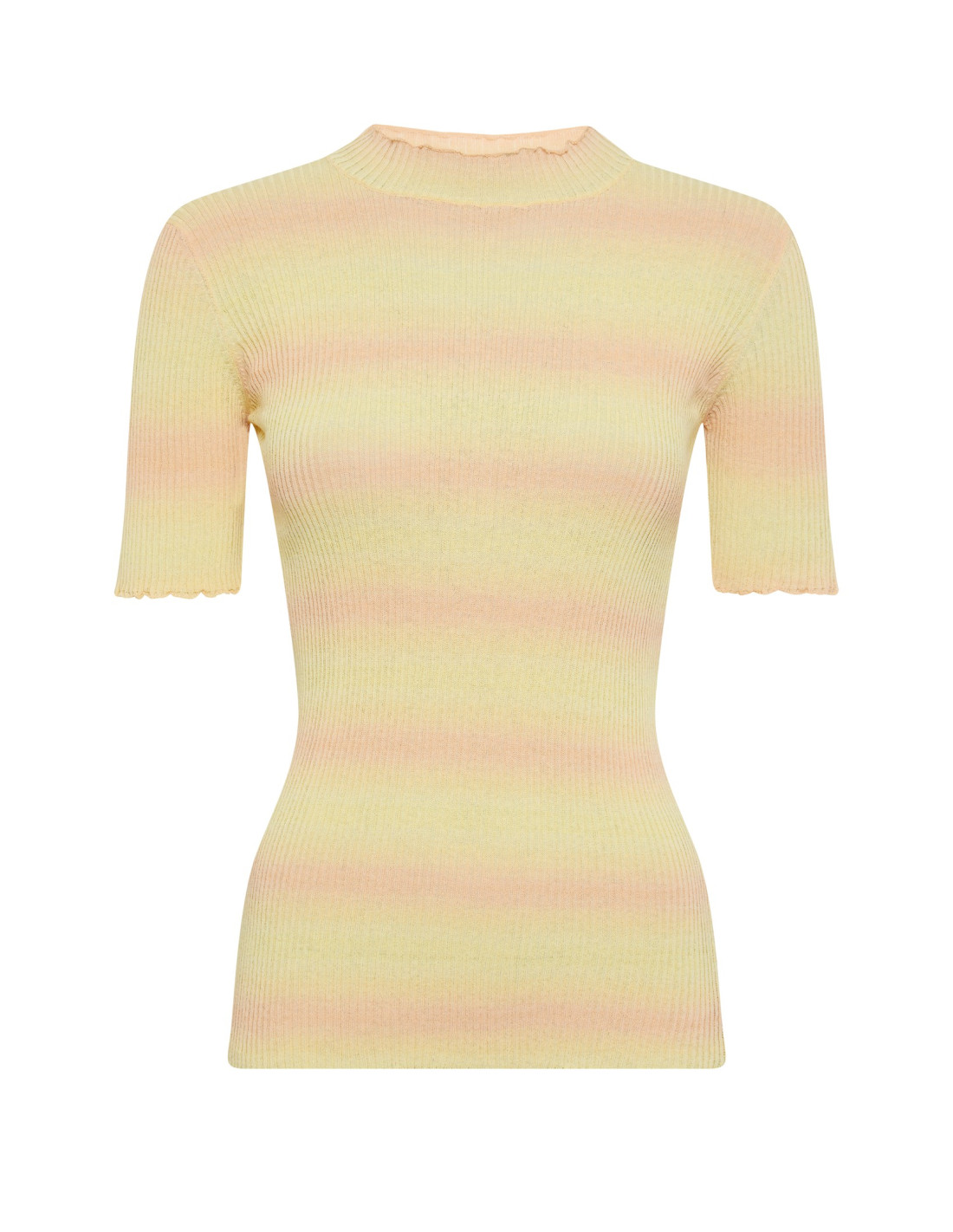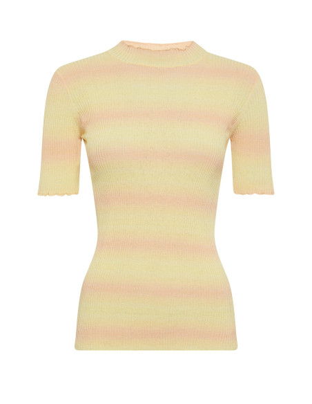 Top en maille rayée Victoire avec jaune, rose, coton mélangé, construction en maille, effet dégradé, imprimé à rayures horizontales, col ras du cou, manches courtes et ourlet ondulé.