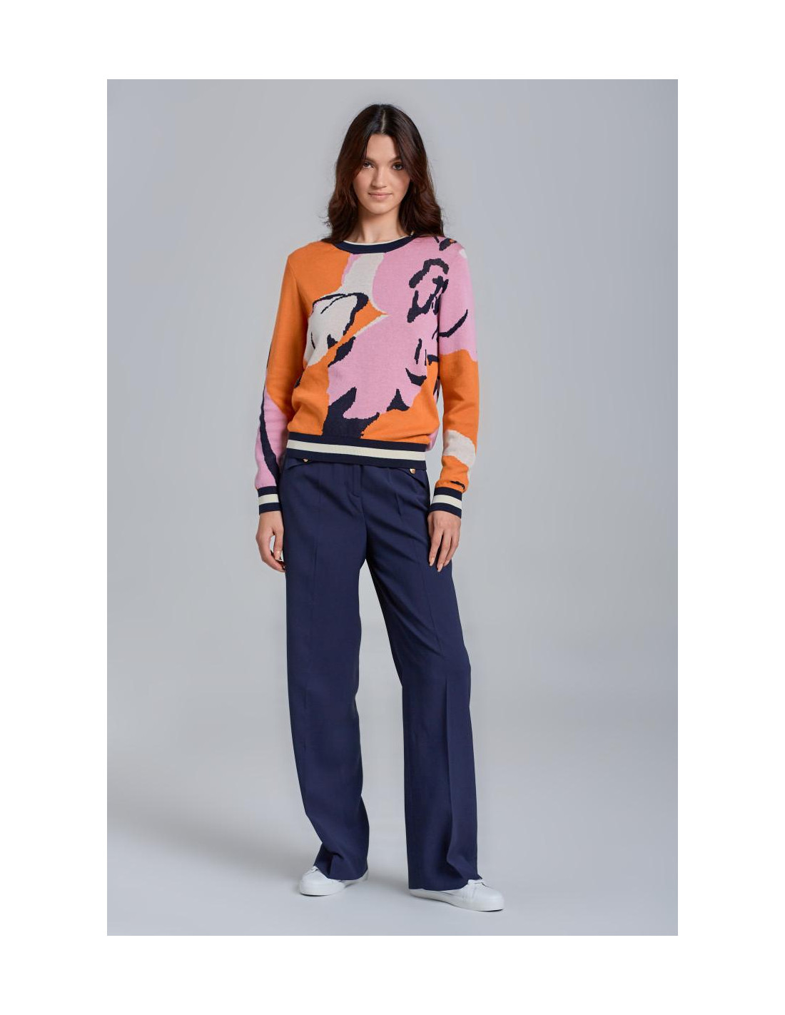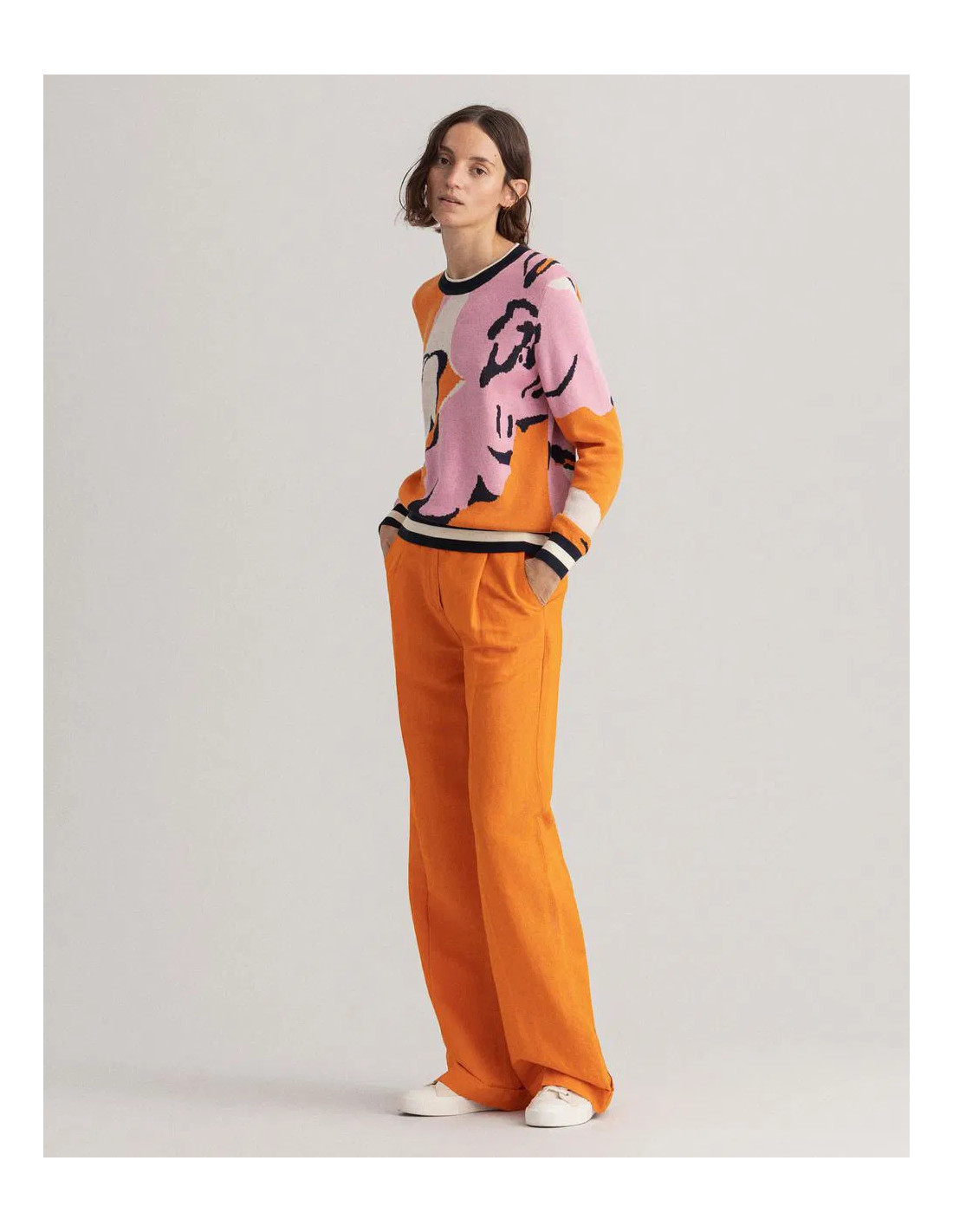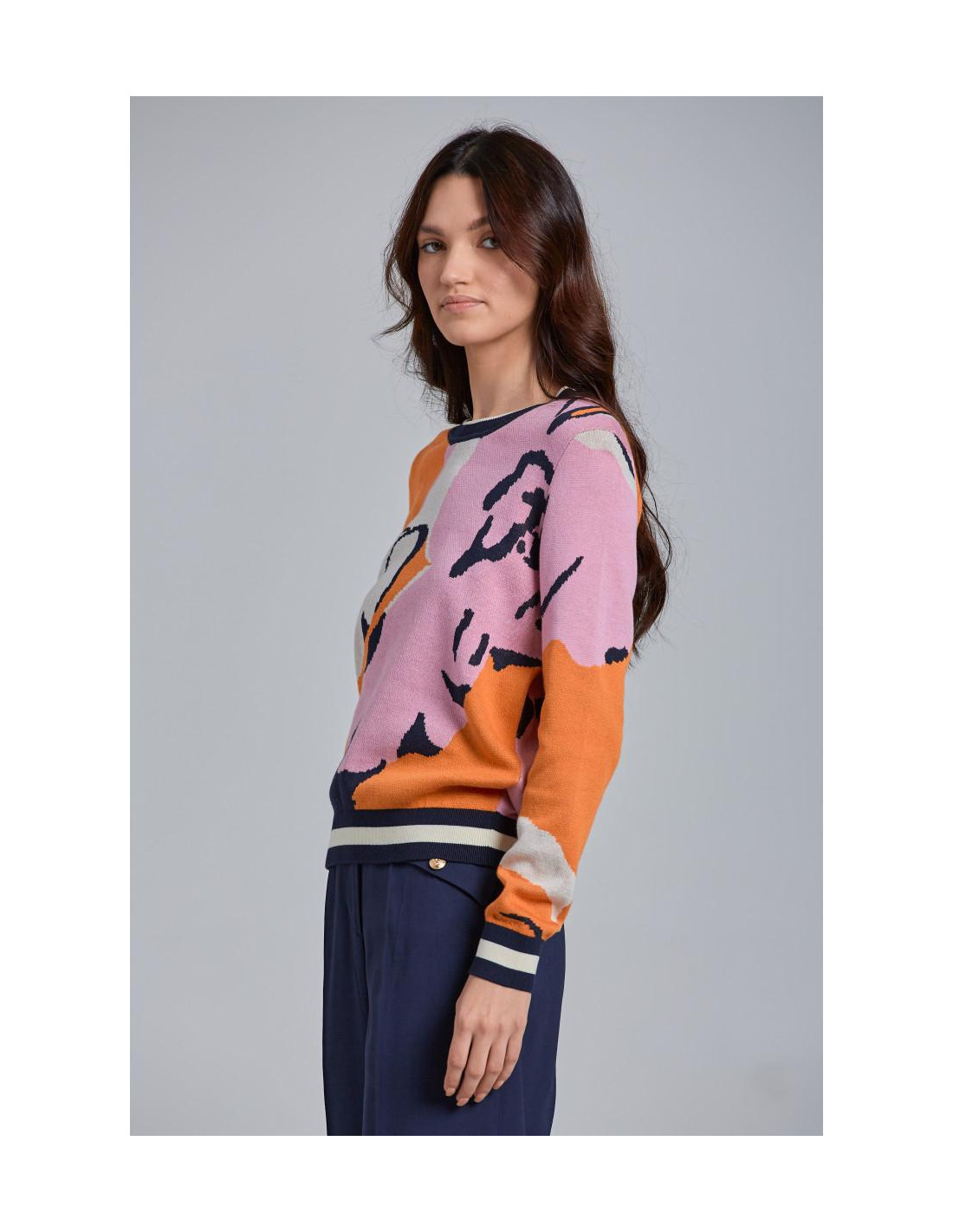 Ce pull arbore un style universitaire grâce à sa maille de coton douce et ses surpiqûres contrastantes aux manches. Sa coupe classique et son motif floral apportent une touche de couleur. Complétez votre look en l'associant à un jean ou une jupe.