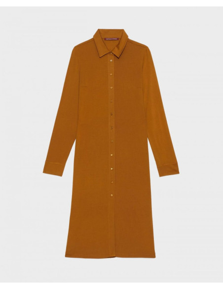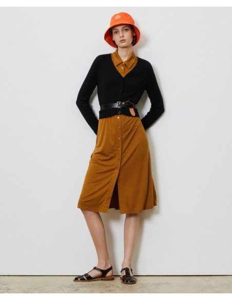 En jersey de soie ultra fluide. Volume légèrement évasé. Longueur sous le genou.