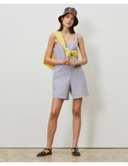 Combishort à bretelles, esprit salopette, en coton seersucker. Corps droit, coupe loose.