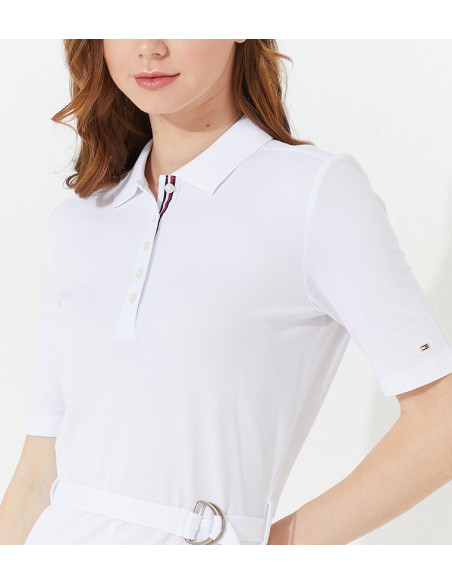 Cette réinterprétation élégante de la robe polo classique de Tommy Hilfiger présente un design ceinturé flatteur et une longueur sous le genou. Caractéristiques • Coton biologique stretch • Col polo • Patte à cinq boutons • Ceinture • Détails signature Tommy Hilfiger Taille et coupe • Coupe classique • Manches courtes • Longueur en dessous du genou