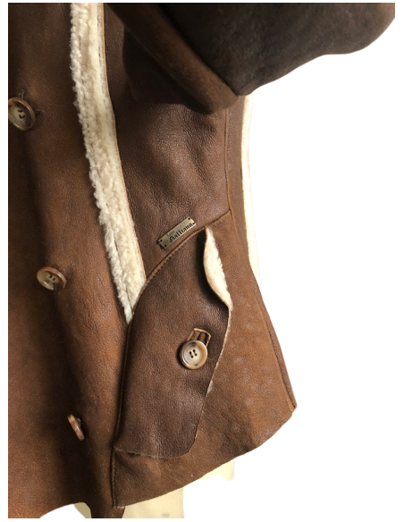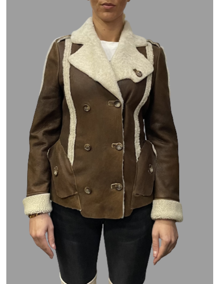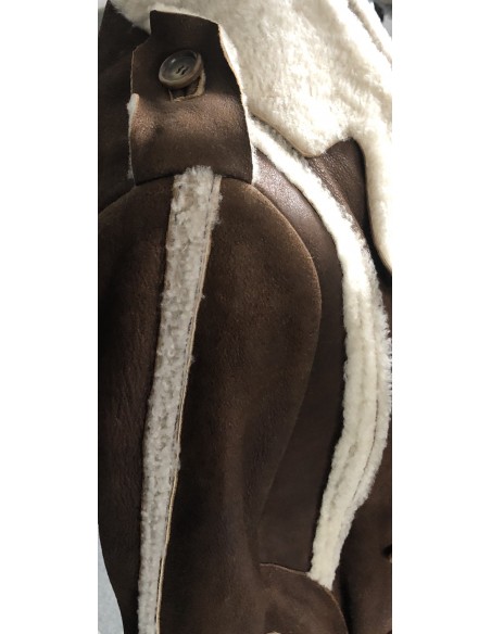 Blouson en peau de mouton lainée fini. Brodée sur le dos. Intérieur laine de mouton rasée, poignets boutonnés, fermeture par boutons. Fabriquée en Italie.