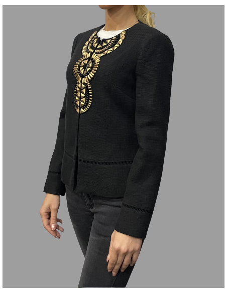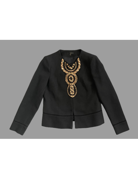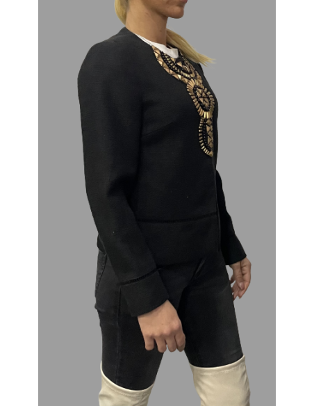 Veste courte à l'allure citadine et parée d'ornement doré complètement dans l'air du temps. Vous allez aimez cette veste de mi-saison, coupe droite, sans col.