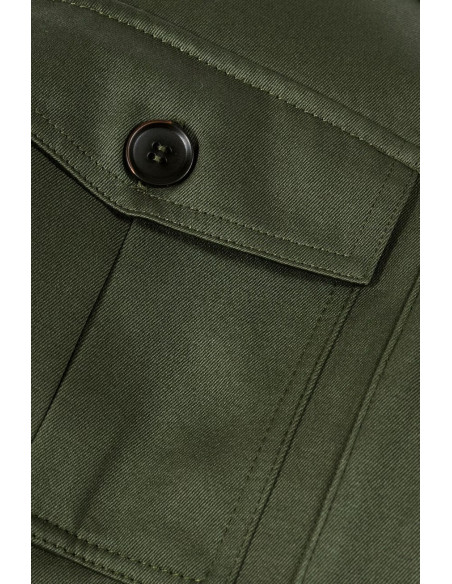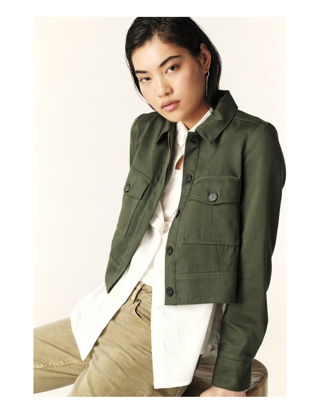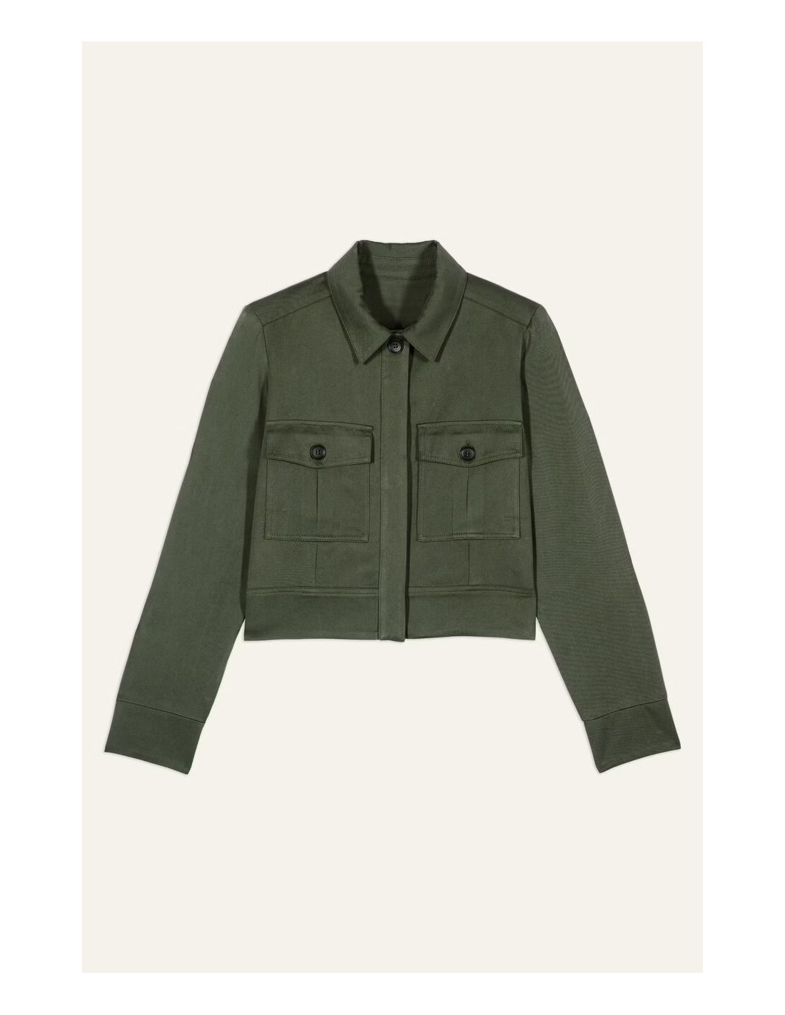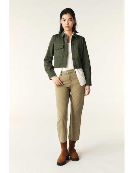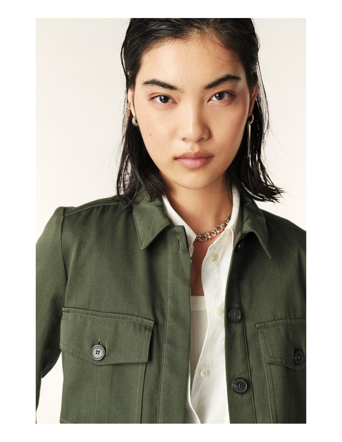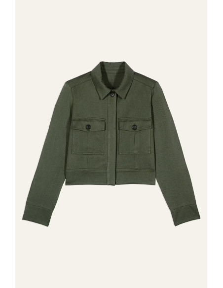 La veste ELIA est un modèle boxy avec des manches longues. Avec le détail de bords rapportés en bas de la veste. Des poches sur la poitrine, col chemise.
