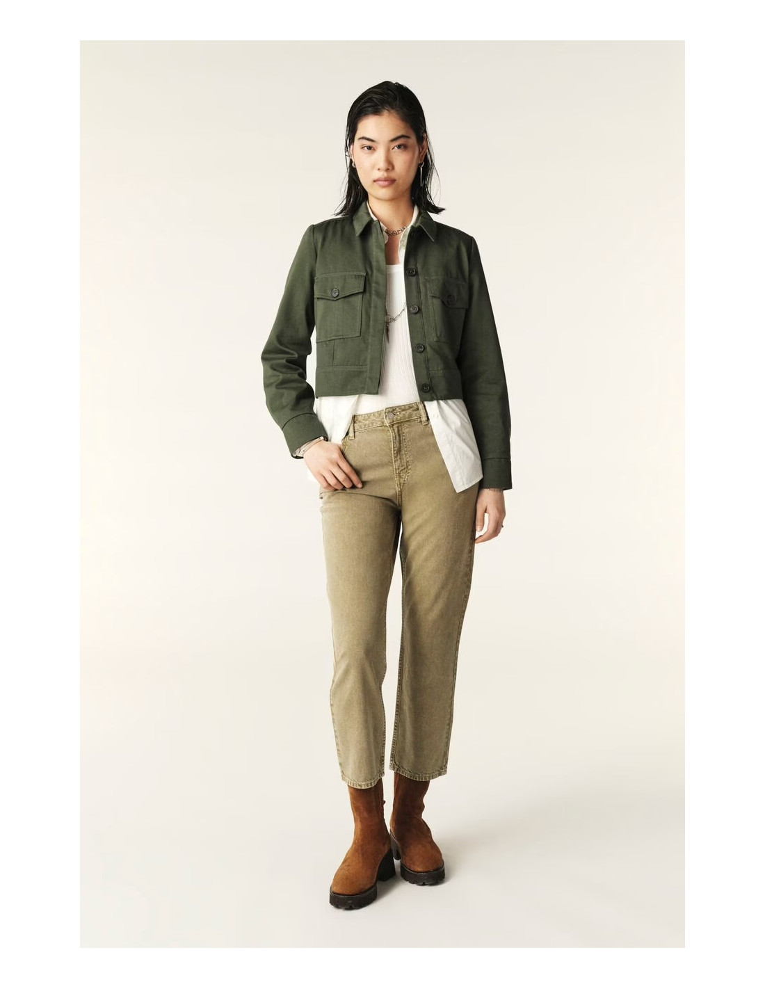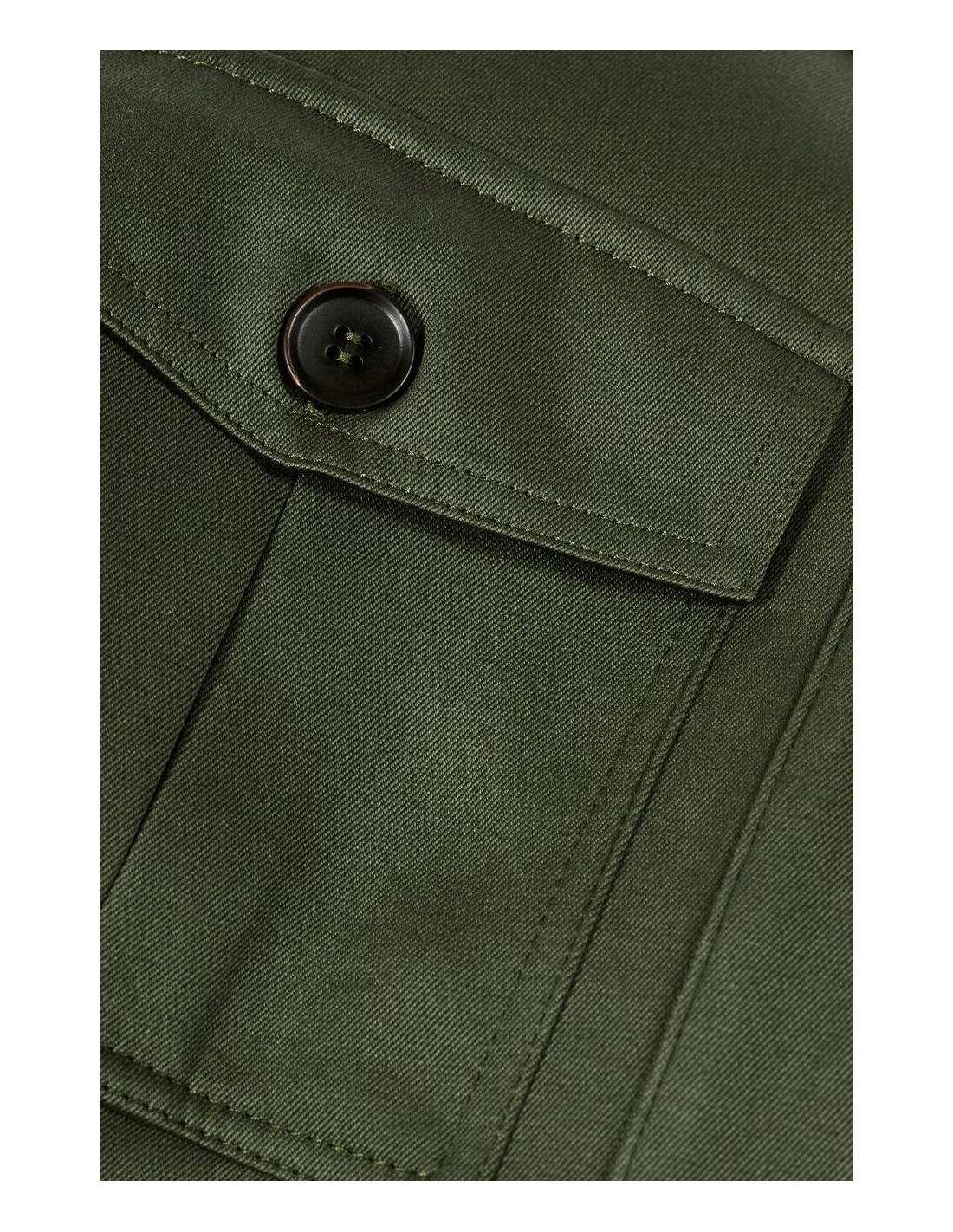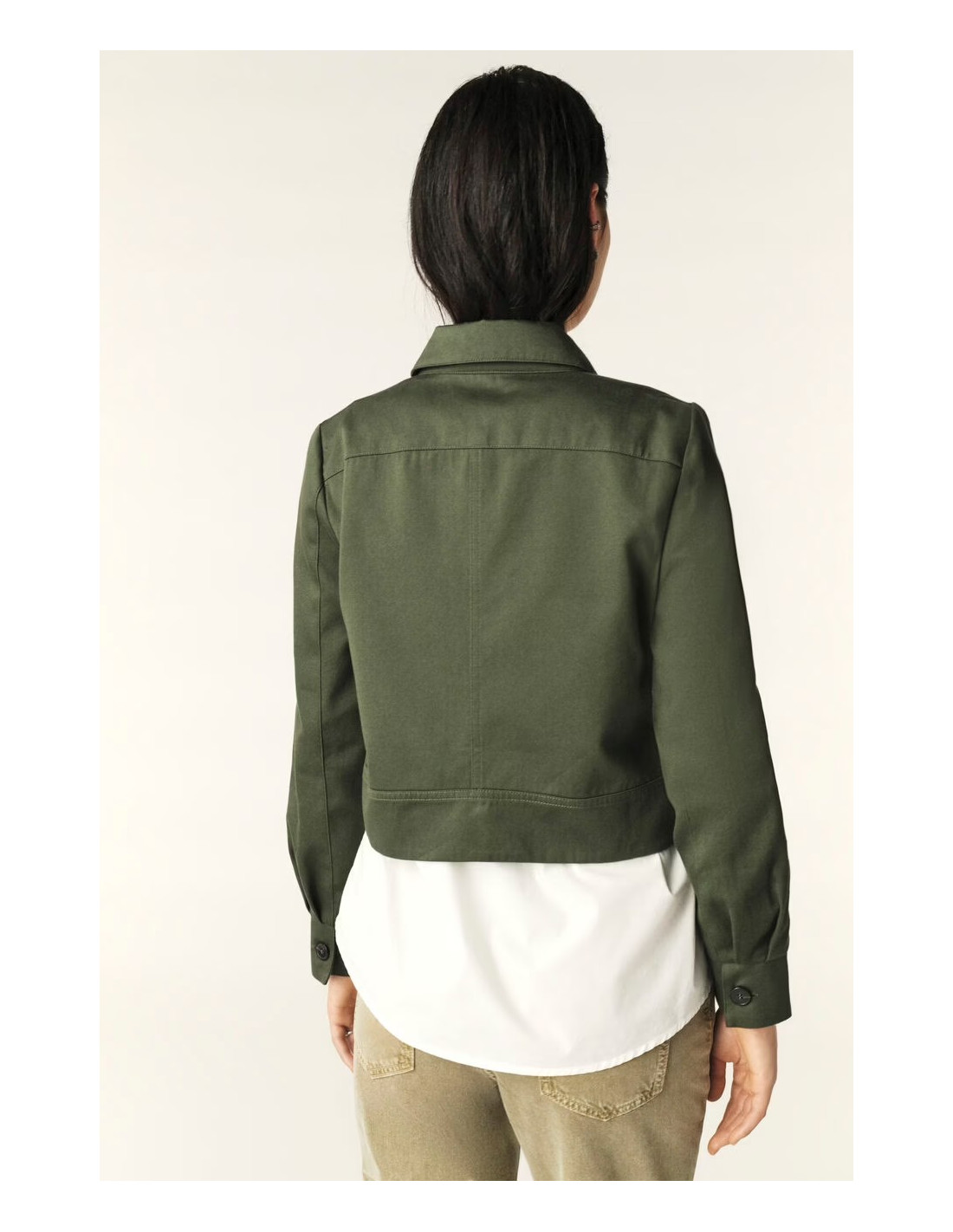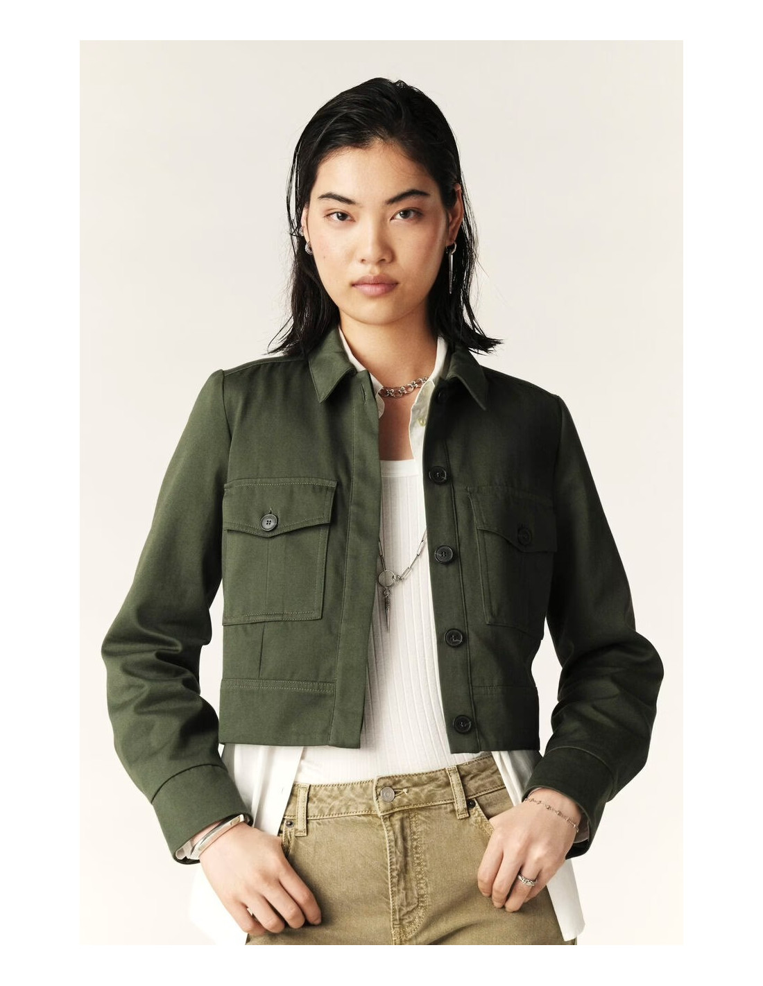 La veste ELIA est un modèle boxy avec des manches longues. Avec le détail de bords rapportés en bas de la veste. Des poches sur la poitrine, col chemise.